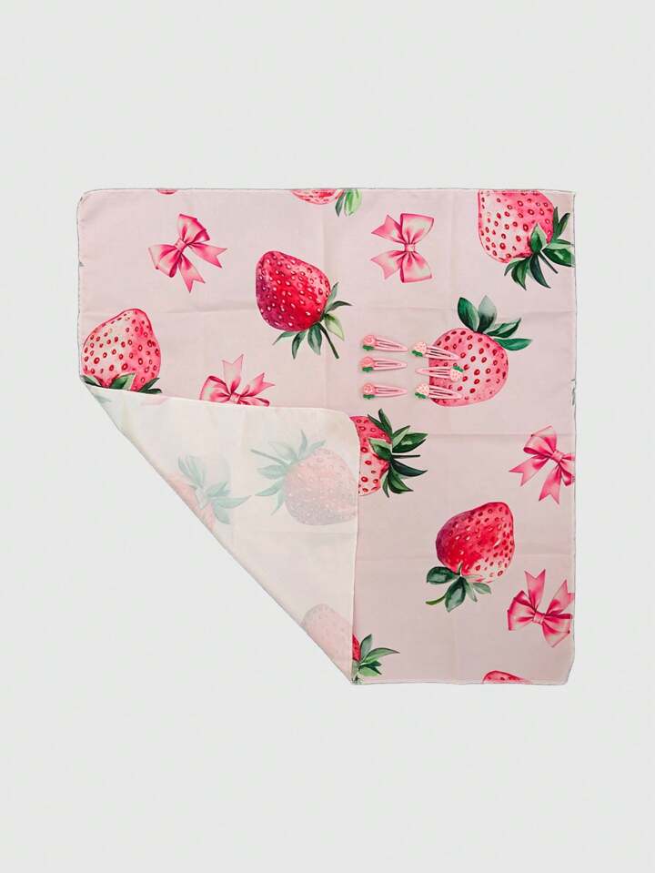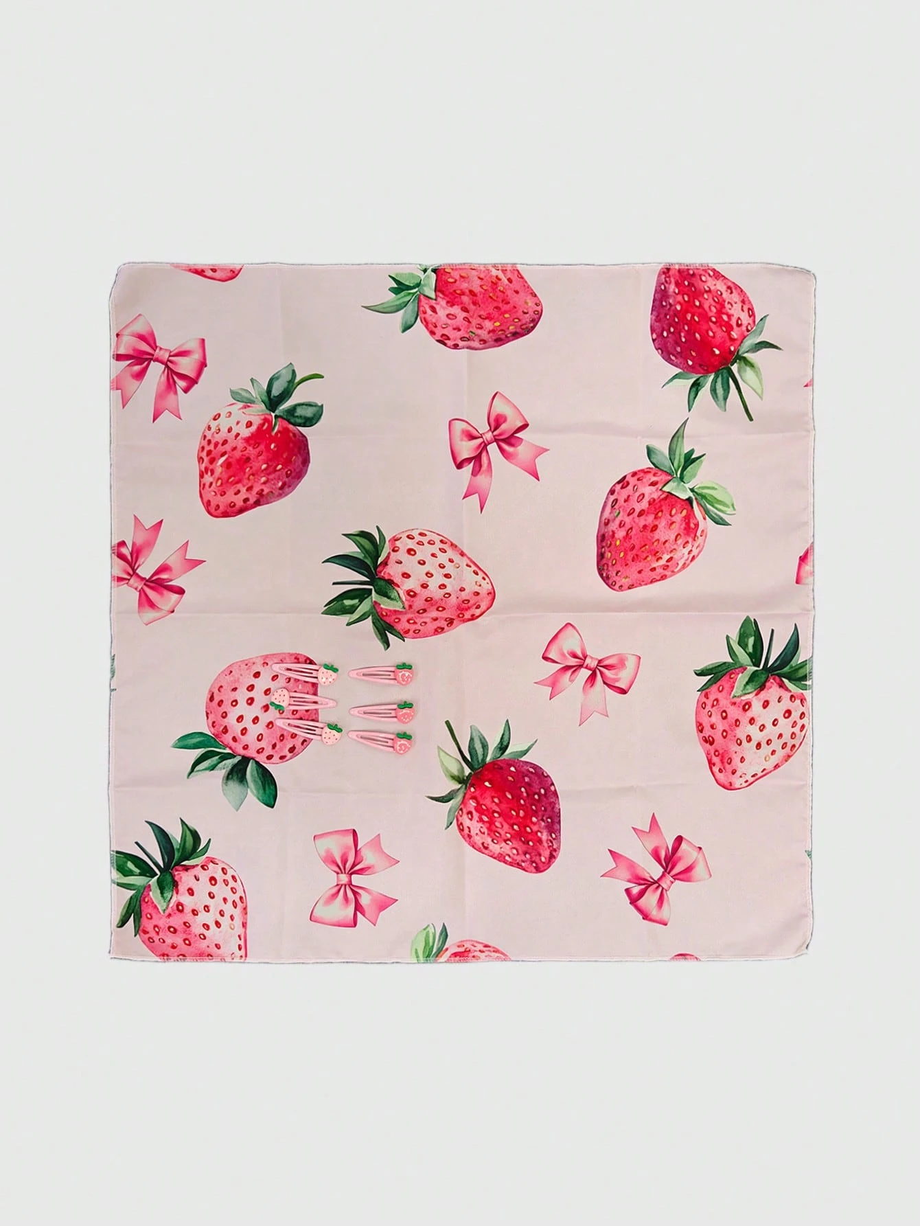 Kawaii 1 Set incluye 1 pañuelo cuadrado pequeño estampado con fresa rosada y lazo + 6 pasadores para el cabello con forma de fresa 3D de colores aleatorios, conjunto de pañuelo y accesorios para el cabello con estampado de dibujos animados de estética Y2K de uso múltiple