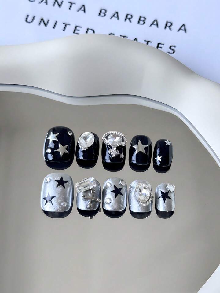 Kawaii 10 uñas cuadradas cortas con diseño gráfico de elementos cósmicos como estrellas y la reina madre del oeste, hechas a mano con piezas de uñas postizas que pueden desmontarse y reutilizarse, adecuadas para damas y chicas que se presenten en escenas como eventos en el escenario, bailes y fiestas. Incluye 1 pieza de rodillo de gel.