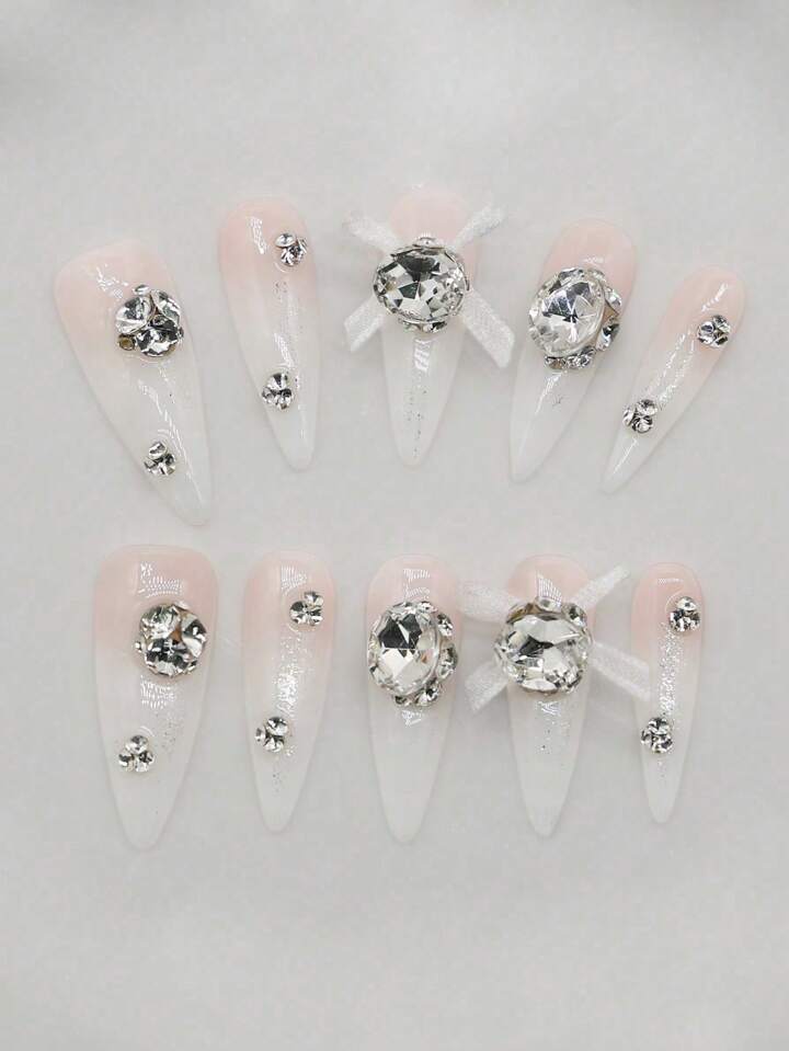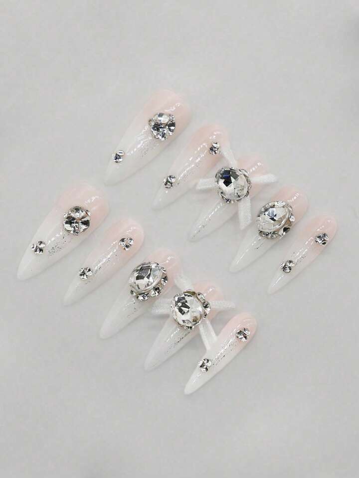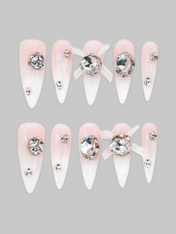 Kawaii 10 piezas de uñas postizas de alta calidad con lazos hechos a mano + 3 láminas de cinta adhesiva de doble cara, pegatinas de lujo para uñas con lazo de encaje estilo ballet, reutilizables y removibles, adecuadas para fiestas, baile y uso diario