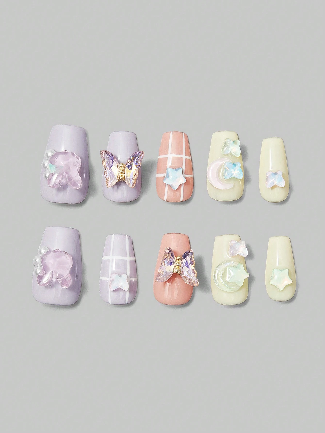 Kawaii 10 piezas Kit de uñas postizas con decoración de mariposa de ataúd largo