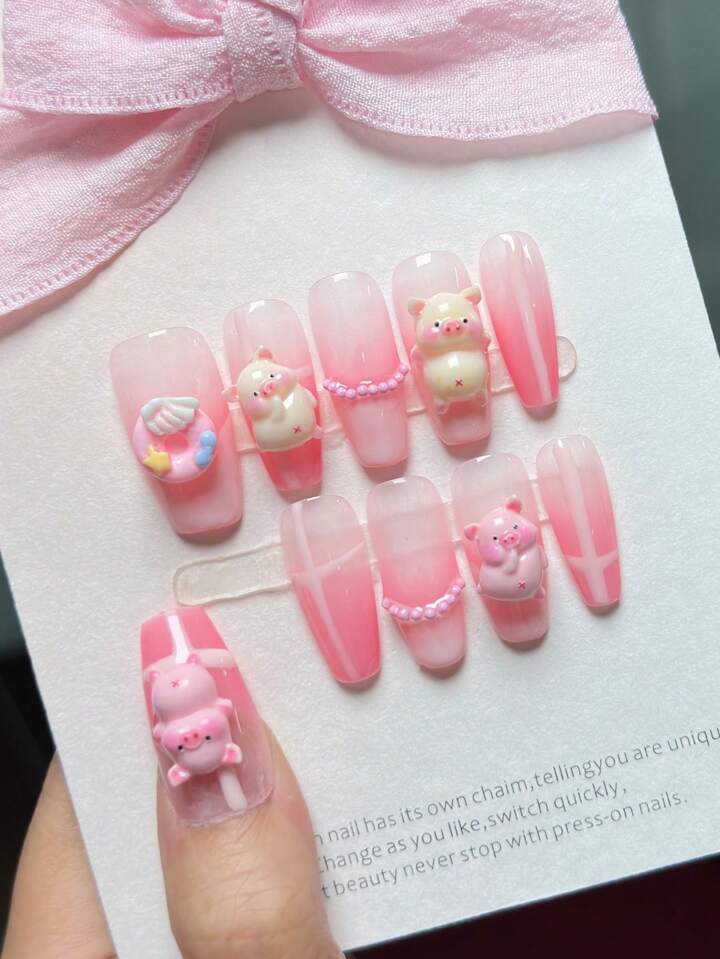 Kawaii 10 Uds. De Envolturas Para Uñas De Cerdo De Dibujos Animados Pintadas A Mano De Color Rosa + 1 Hoja De Cinta Adhesiva De Doble Cara