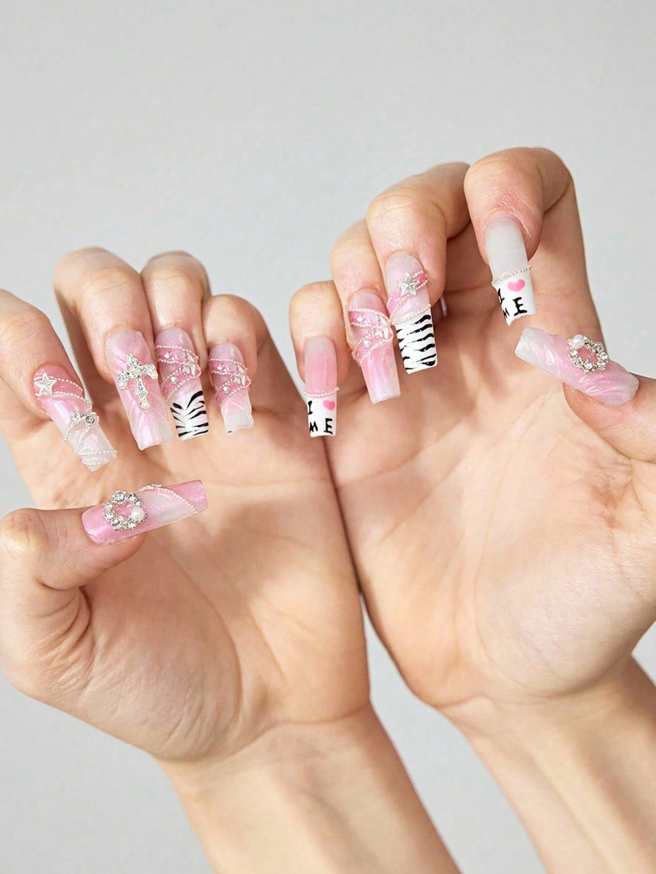 Kawaii 10 piezas de uñas postizas de alta calidad con diseño de color rosa pintado a mano + 3 piezas de adhesivo doble cara, uñas postizas en forma de ataúd largas removibles y reutilizables, pegatinas de uñas decoradas con cristales de color contrastante en estilo "chica caliente", adecuadas para festivales, fiestas, baile y uso diario