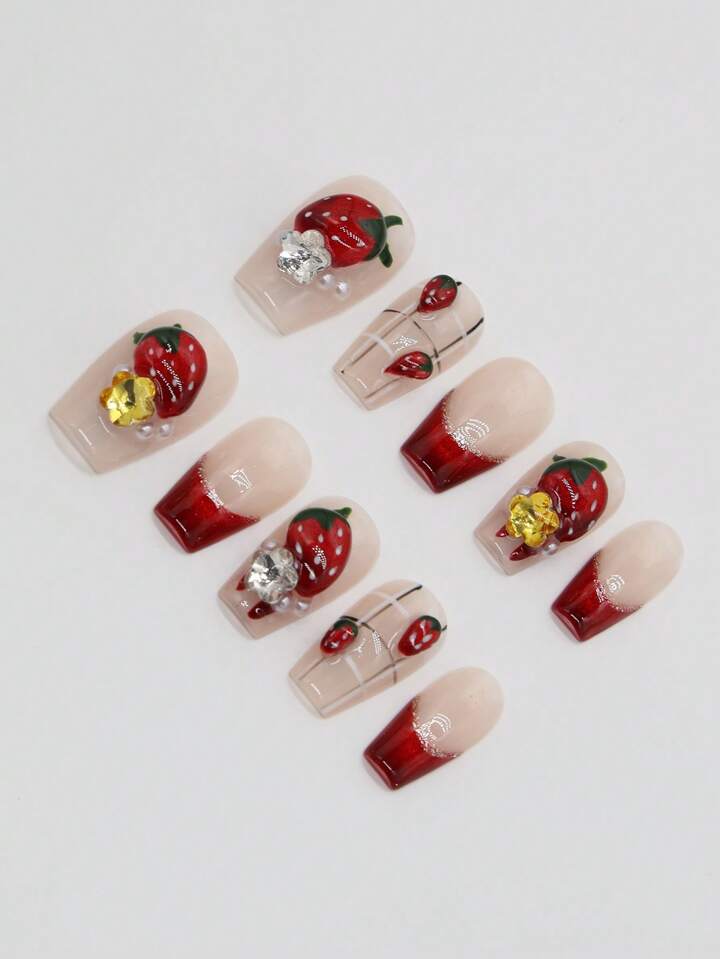 Kawaii 10 piezas de uñas postizas Premium con elementos florales estampados de fresa dulce + 3 piezas de adhesivo doble cara, pegatinas de uñas de colores mixtos con diseño de frutas desmontables con pintura a mano, diseño de estilo francés con pegatinas de ojos de gato y piedras rhinestone para manicura, adecuado para festivales, fiestas, baile y uso diario