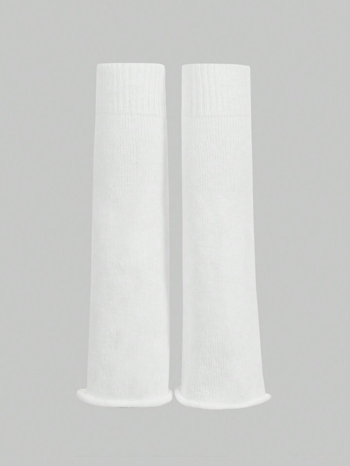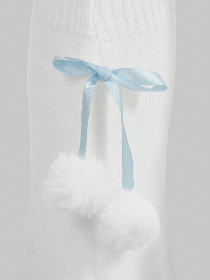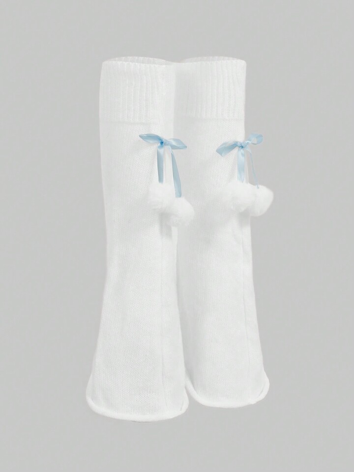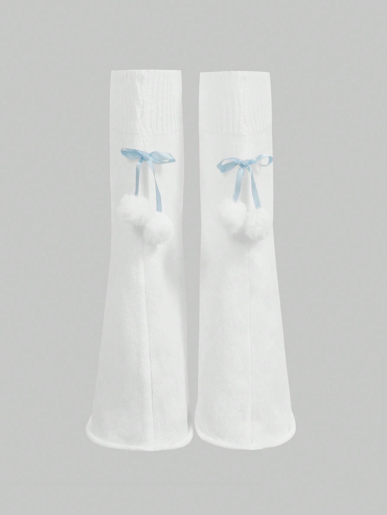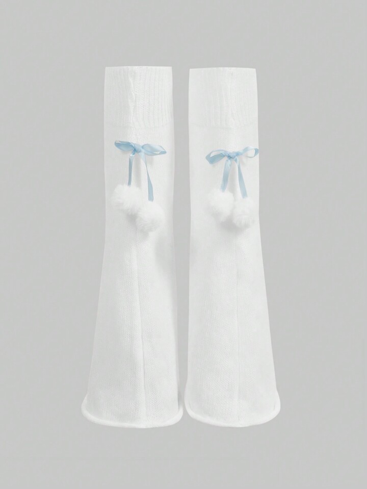 Kawaii 1 par de calentadores de piernas con pompón esponjoso y lazo, mangas de pierna sólidas con dobladillo con volantes, estilo anime para mujeres