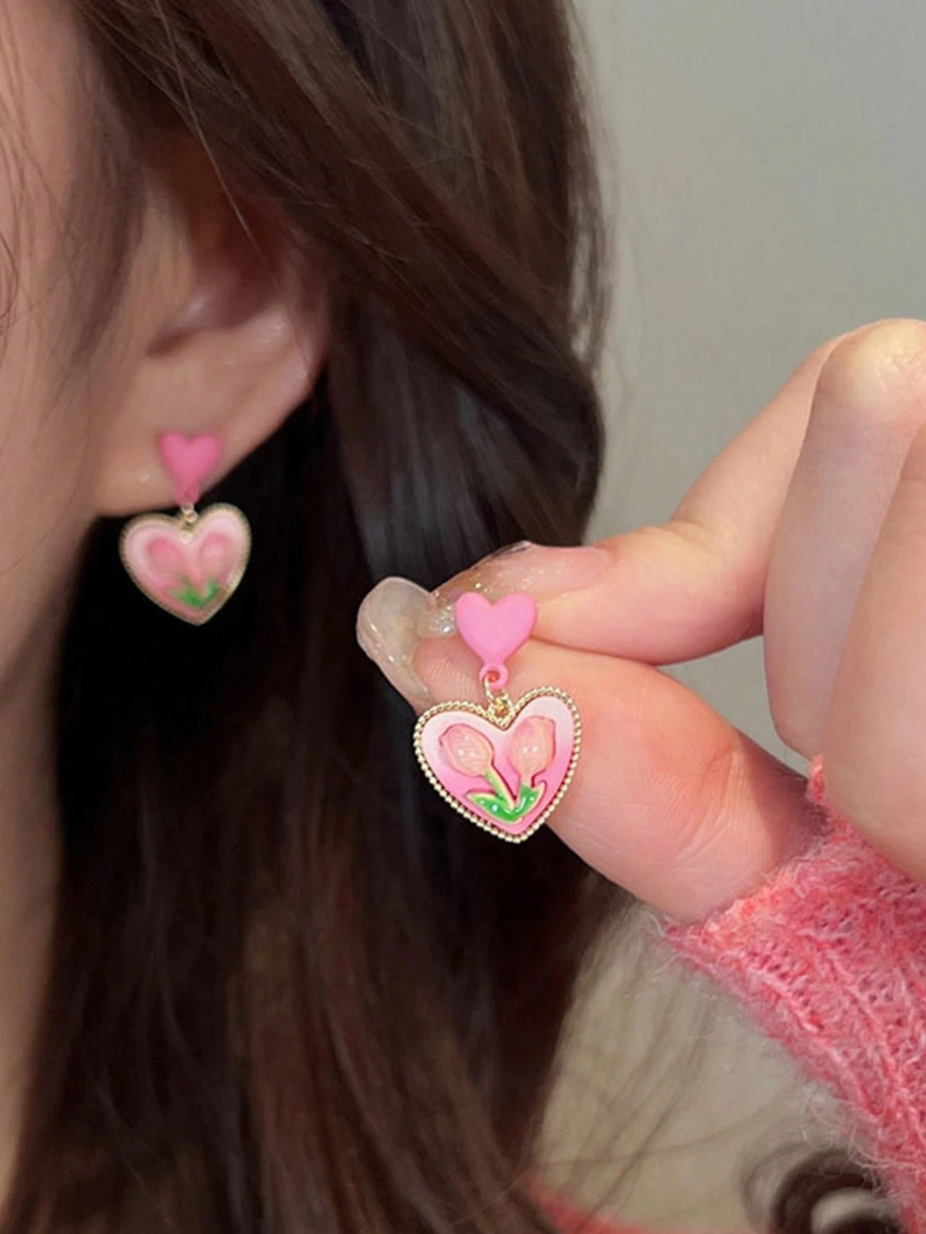 Kawaii 1 Par Aretes Colgantes Con Forma De Corazón Y Tulipán