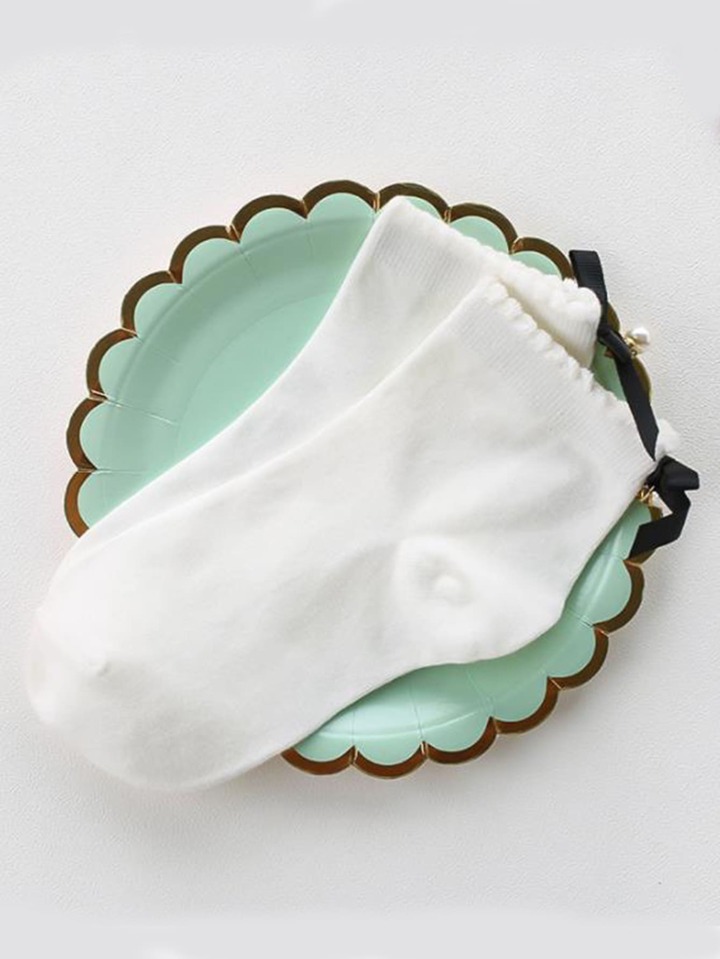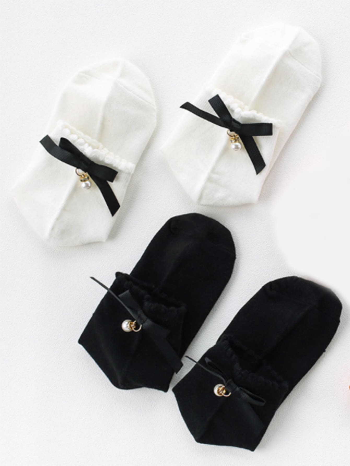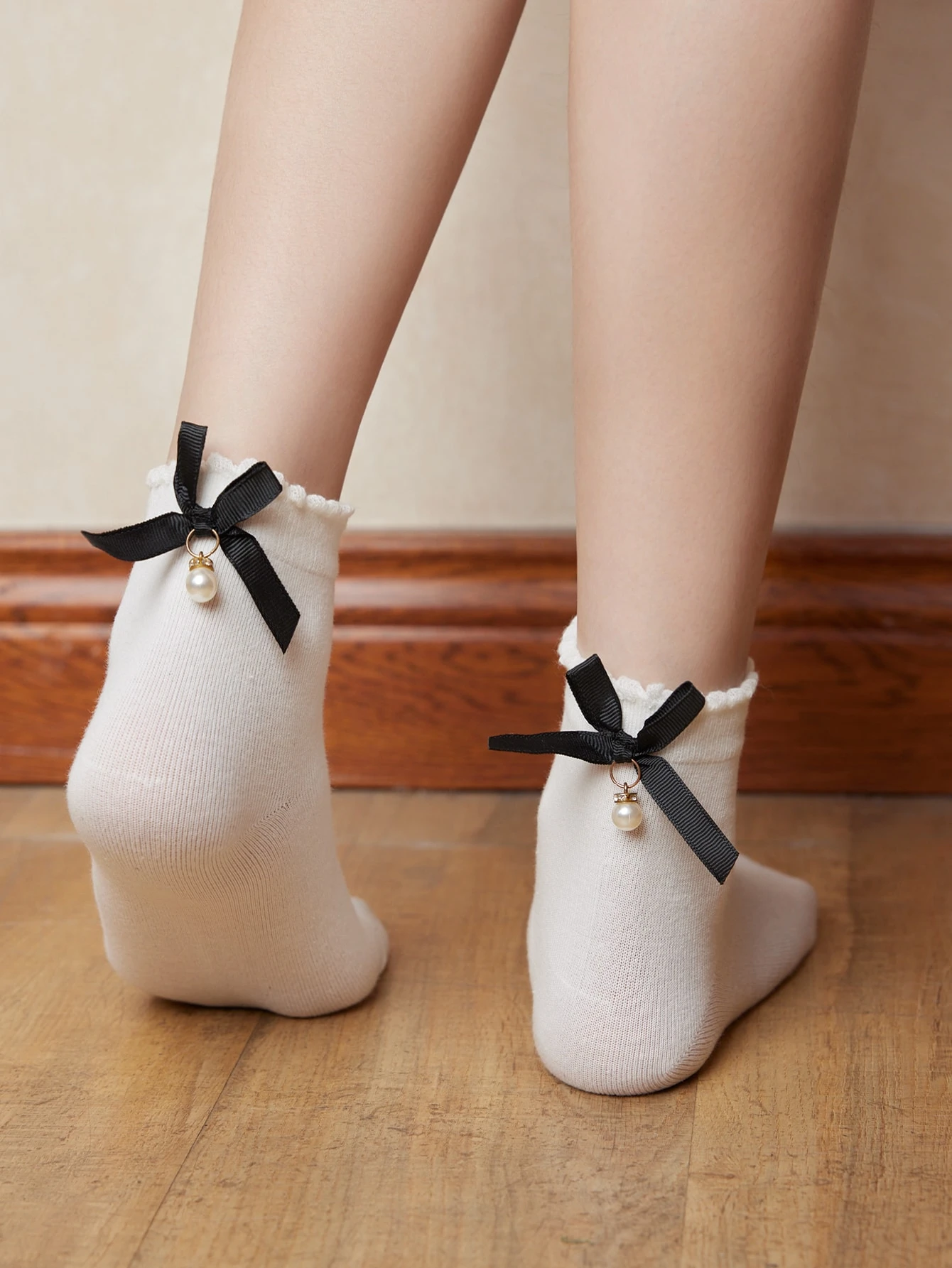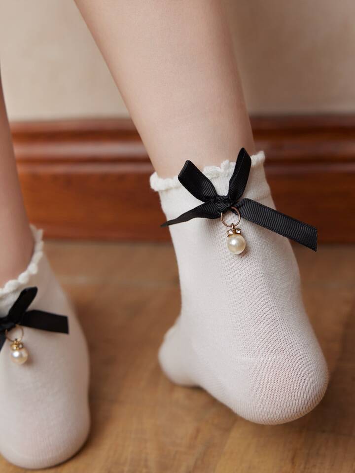 Kawaii 1 par Calcetines tobilleros al azar con diseño de lazo y perla artificial