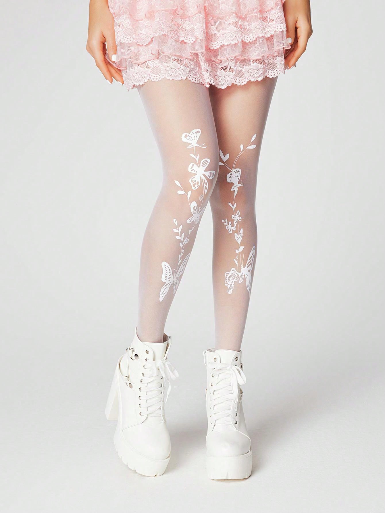 Kawaii 1 par de medias con estampado de mariposas y flores, para todas las estaciones, para mujeres