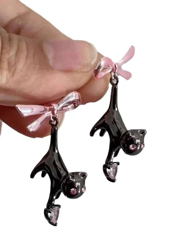 Kawaii 1 par de mujeres gato en forma de con rosado con lazo Arete Tachuelas