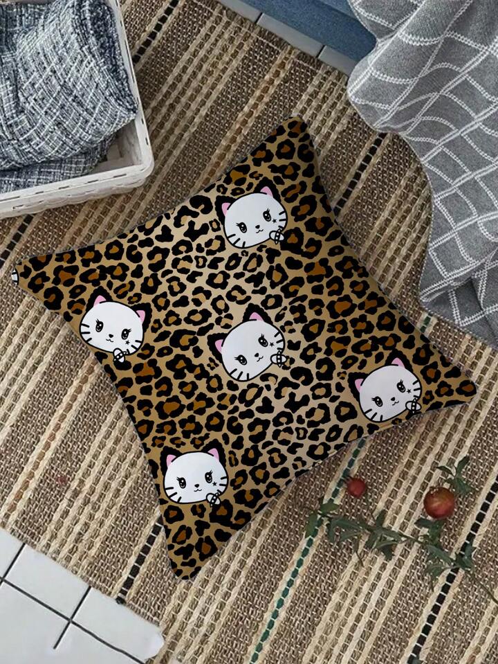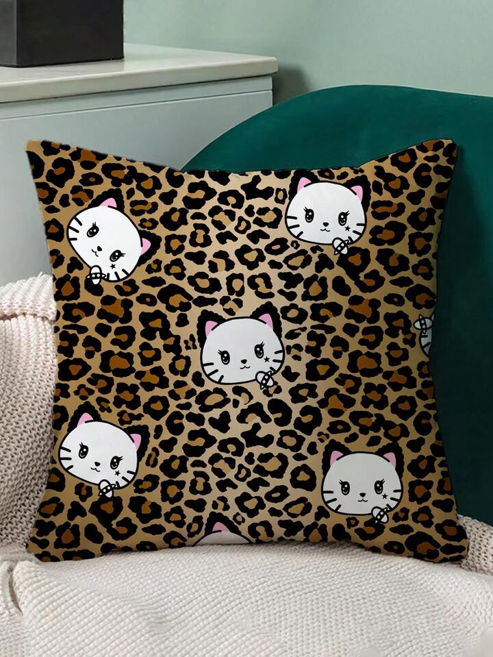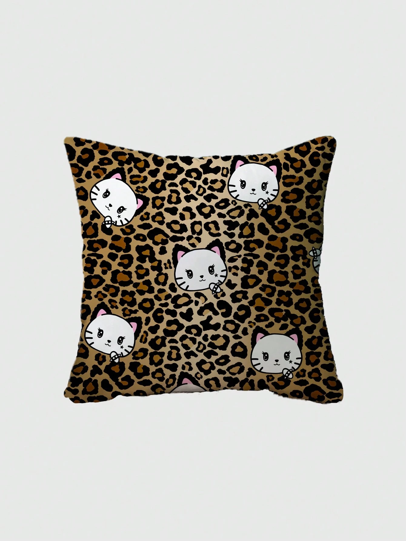 Kawaii 1 pieza Funda de cojín de felpa de doble cara con estampado de gato lindo, adecuado para sala de estar, dormitorio, comedor