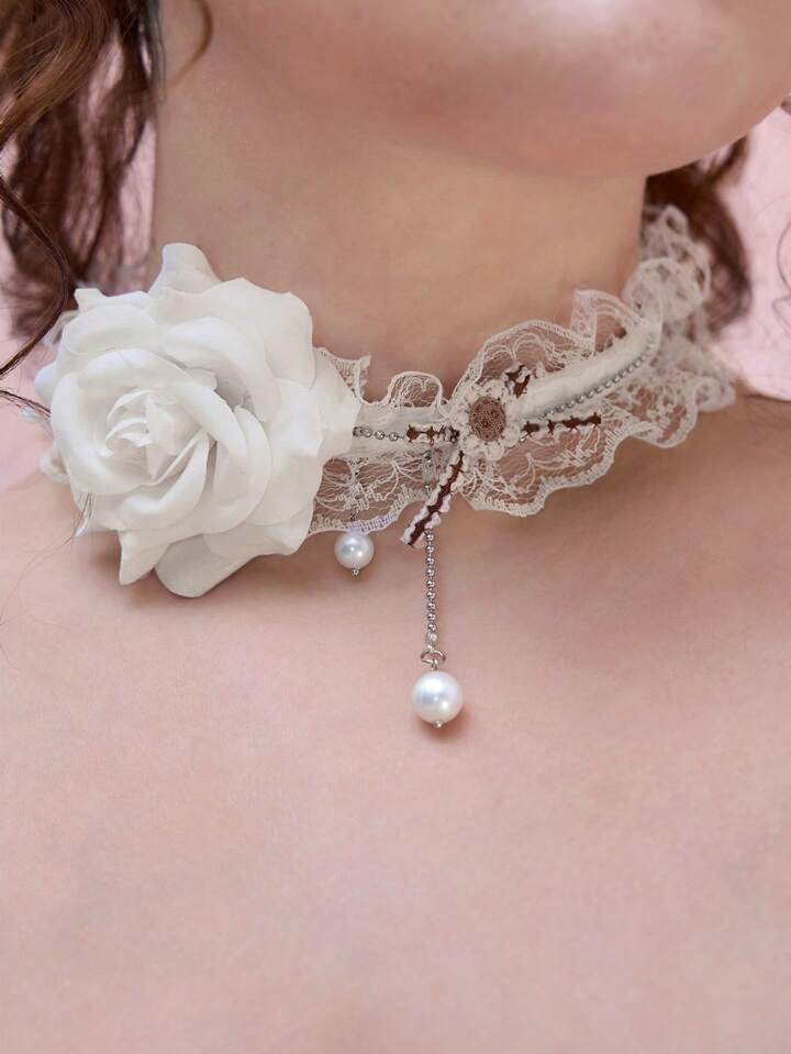 Kawaii 1 pieza Collar gargantilla de estilo palaciego de piel sintética (PU) con colgante de rosa fresca y dulce y perla, accesorio de cuello con encaje de diseño exclusivo