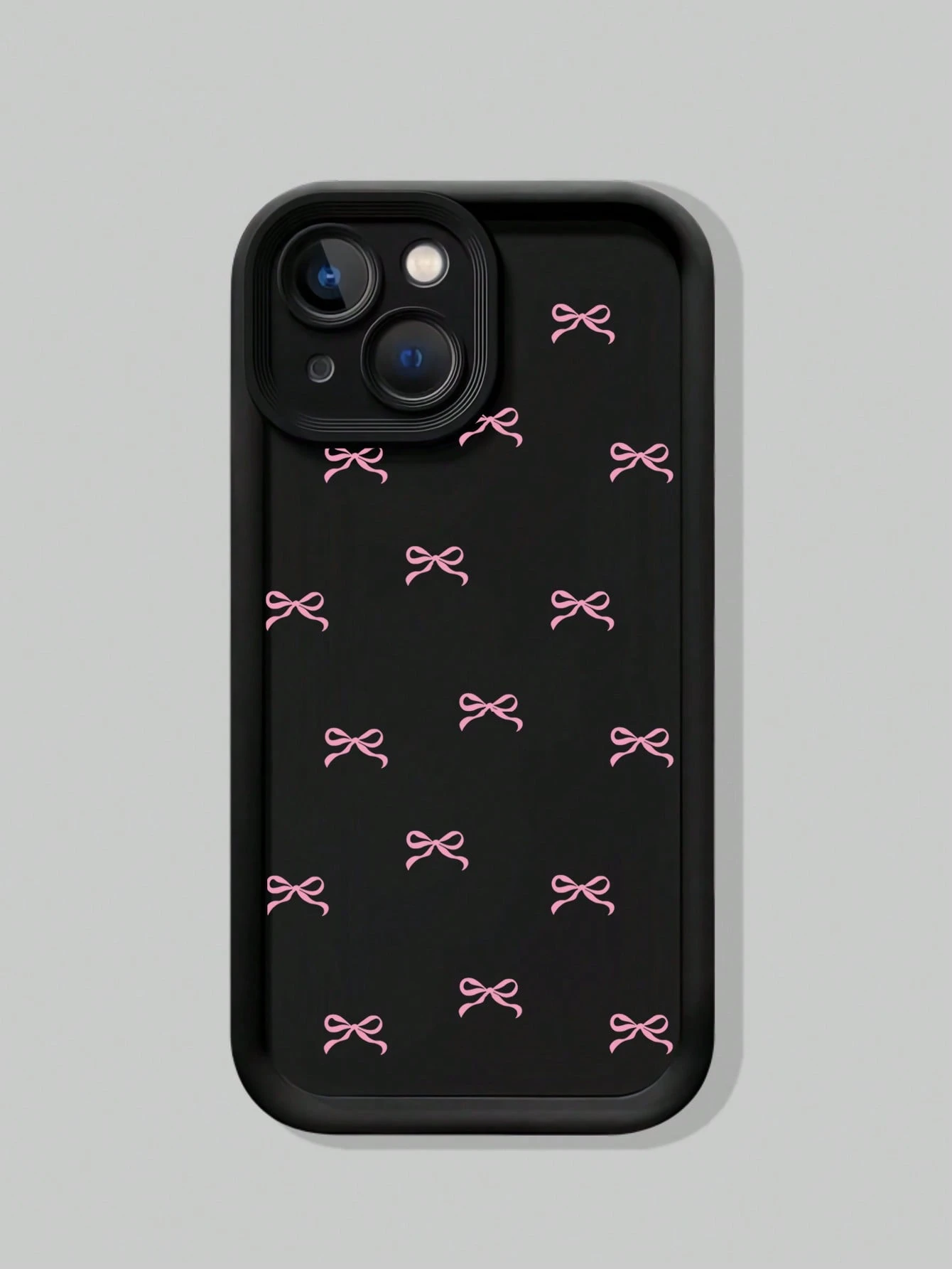 Kawaii 1 pieza Funda de teléfono negra compatible con Apple iPhone 13 14 15 16 con decoración de lazo rosa y negro