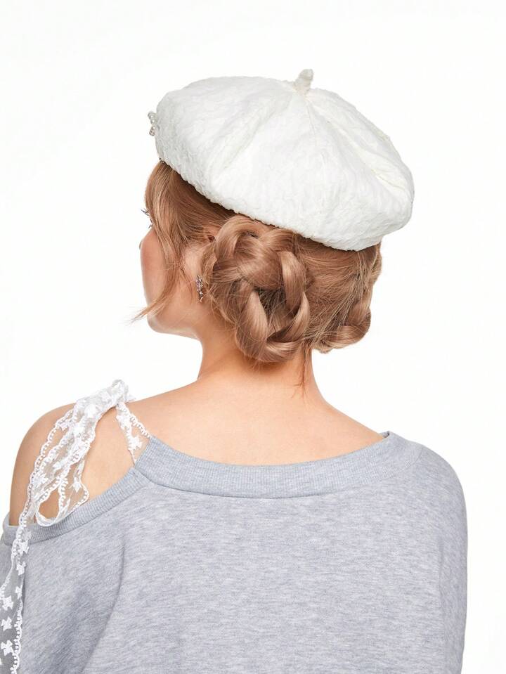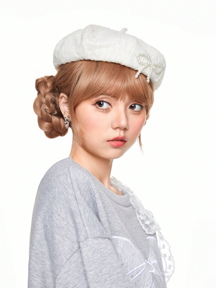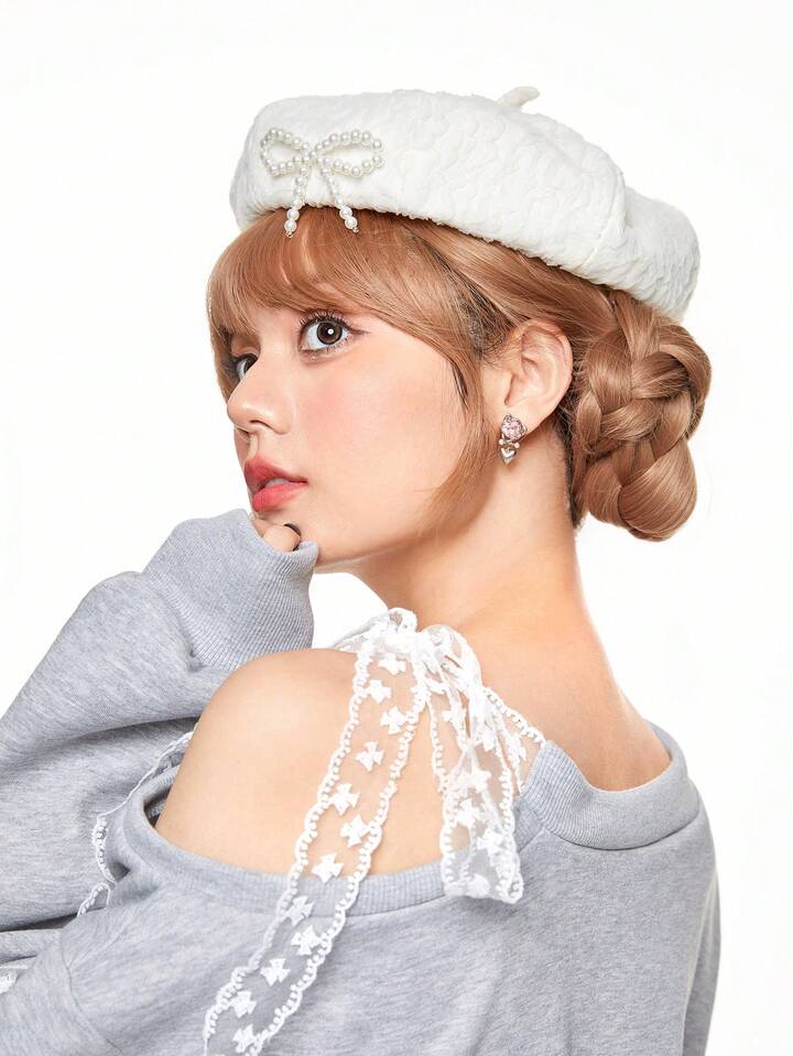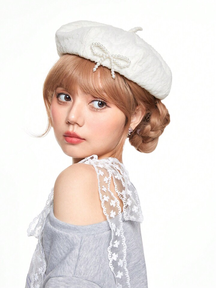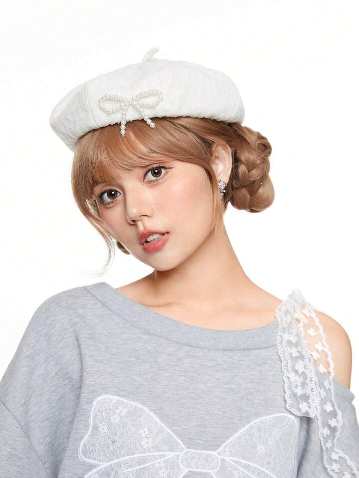 Kawaii 1 pieza Boina de unicolor y adorable con decoración de lazo de perlas falsas, diseño Y2K, apta para uso diario, fiestas de baile y otras ocasiones