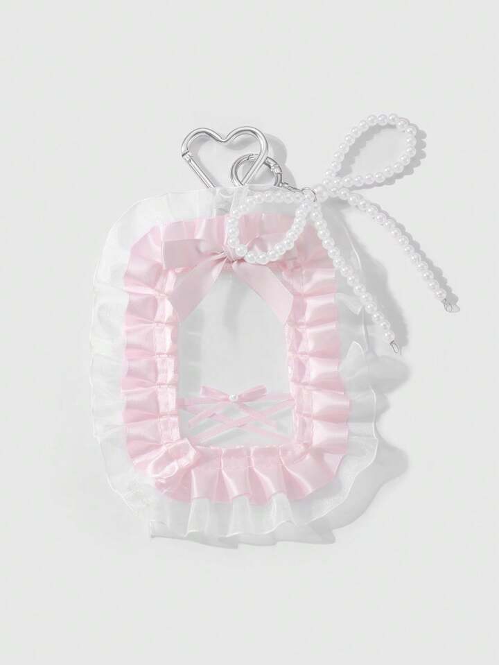Kawaii 1 pieza Elegante titular de tarjeta transparente hecho a mano con perlas falsas blancas, lazo de encaje de red rosa y colgante de llavero, adecuado para trabajadores de oficina, estudiantes, uso diario, regalo para festivales