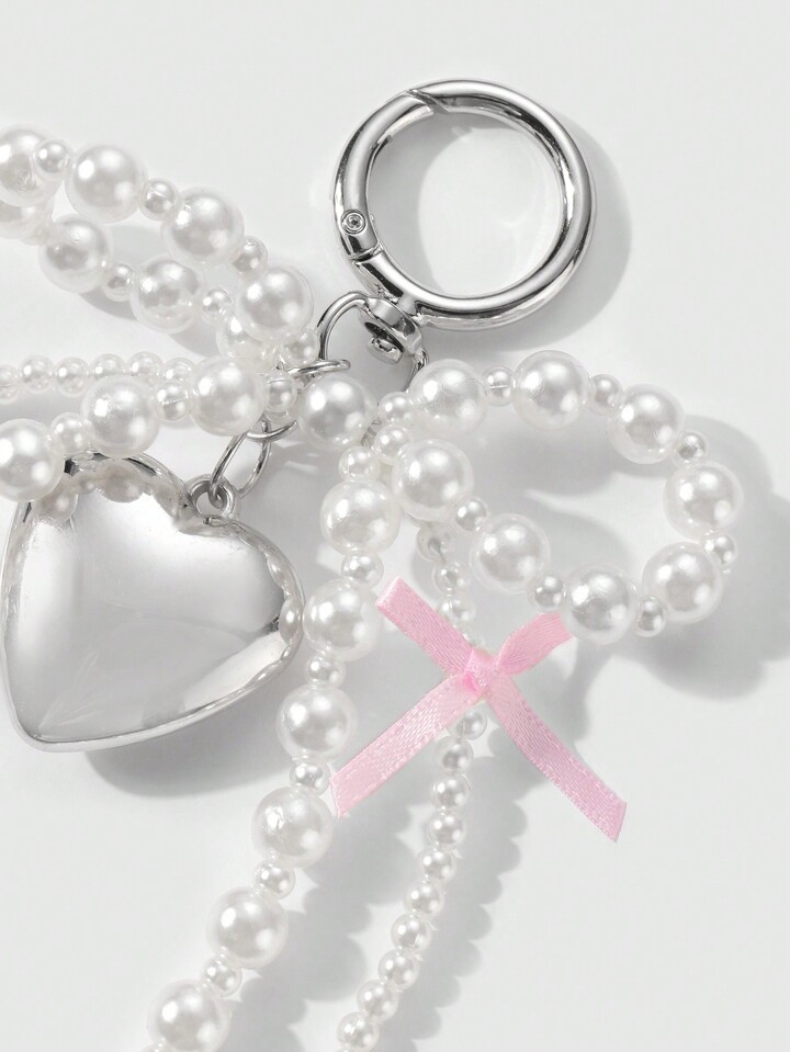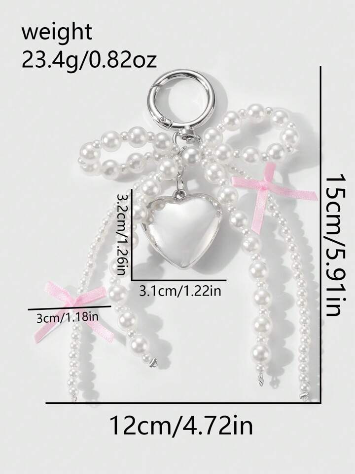 Kawaii 1 pieza Elegante y dulce Llavero de cuentas blancas de perlas falsas hecho a mano, con lazo de cinta rosa y decoración con corazón, adecuado para que las mujeres lo usen como accesorio diario o como regalo de festividad