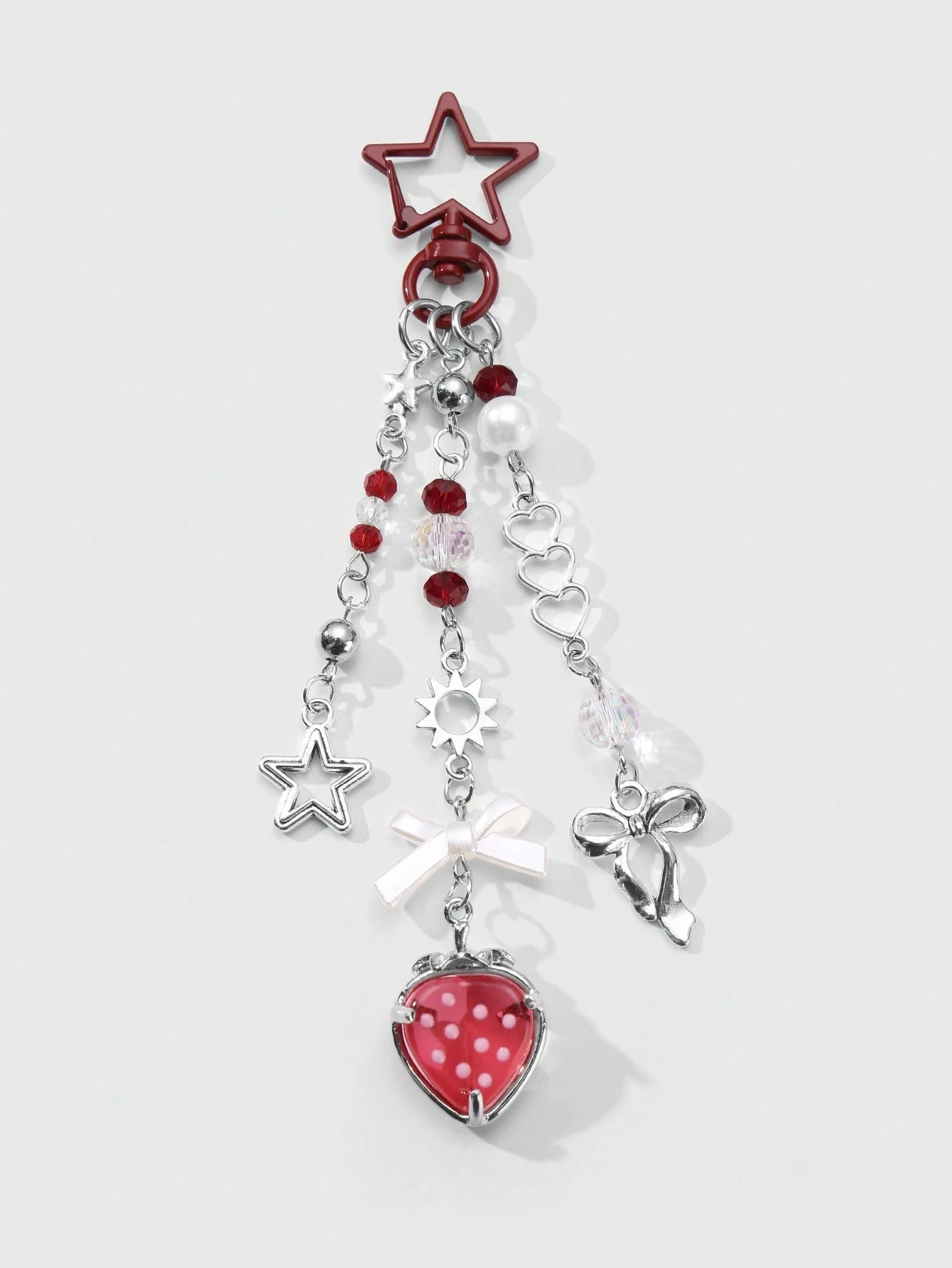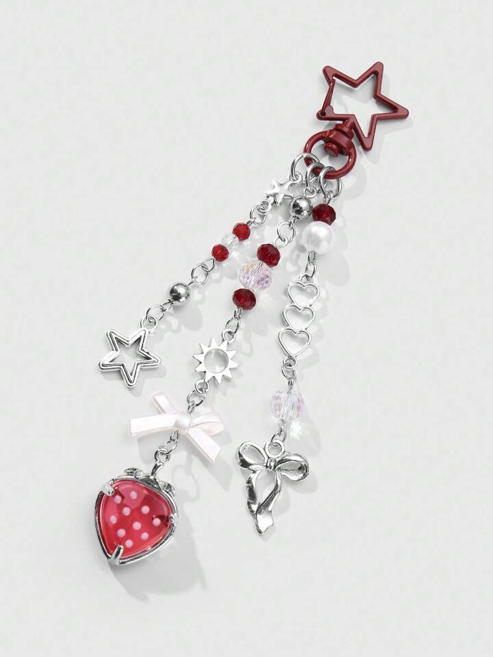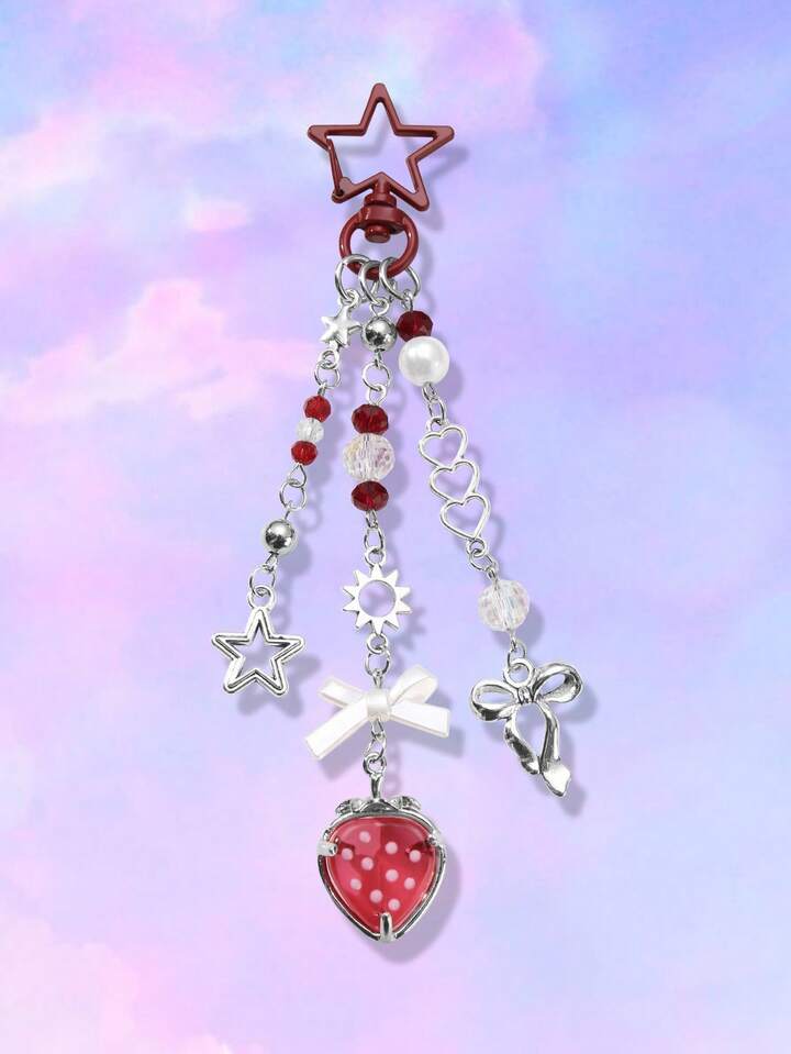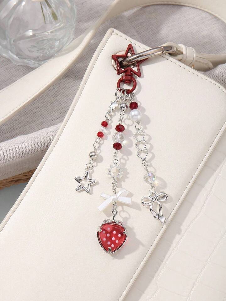 Kawaii 1 pieza de cadena de plata con dije de perla sintética, cristal, estrella hueca, corazón, mariposa y fresa, de moda, versátil y con apariencia de alta gama, para hacer llavero, accesorio de bolso, adecuado para damas, uso diario y regalo de vacaciones
