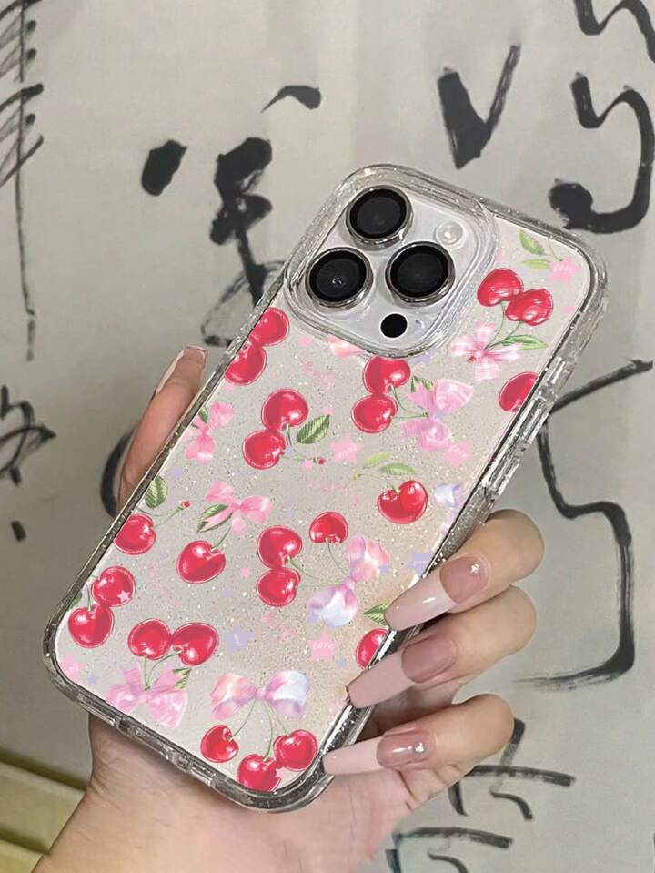 Kawaii 1 funda de teléfono de brillo con lazo de cereza y bling compatible con iPhone 11 12 13 14 15 Pro Max
