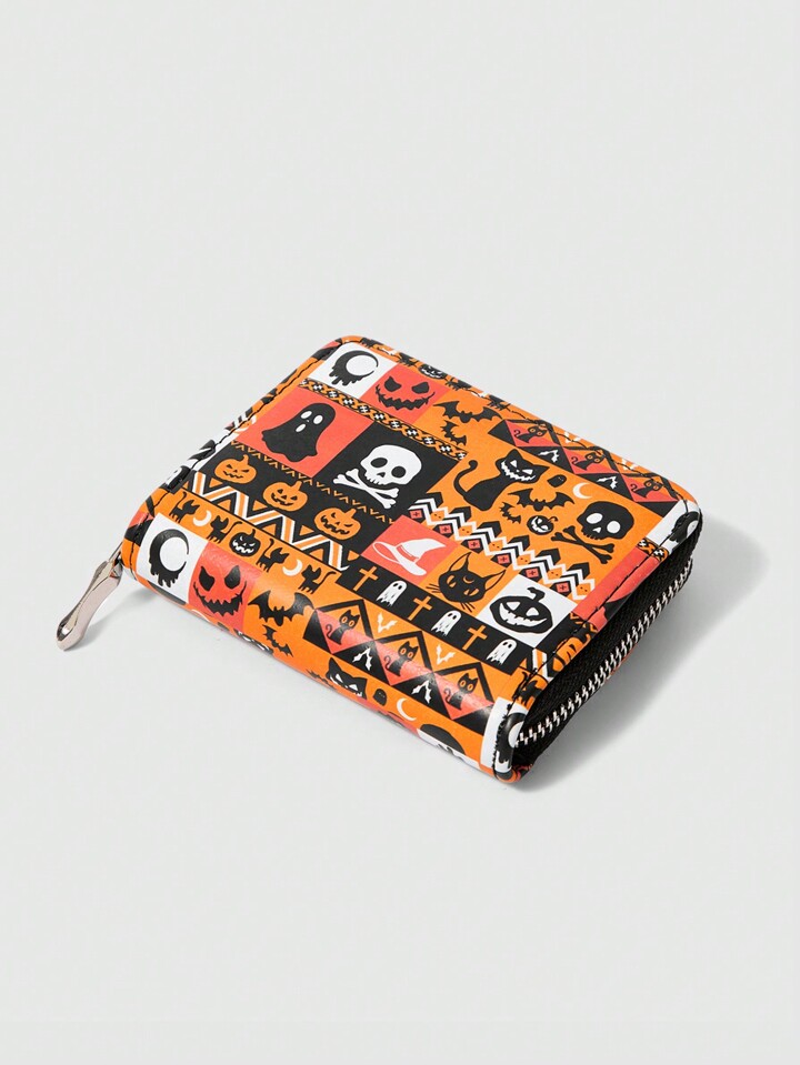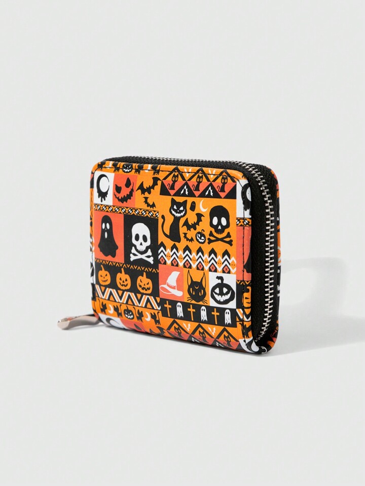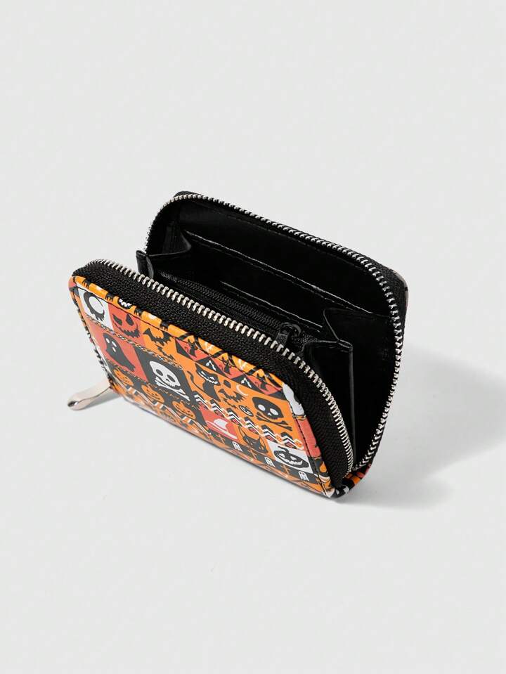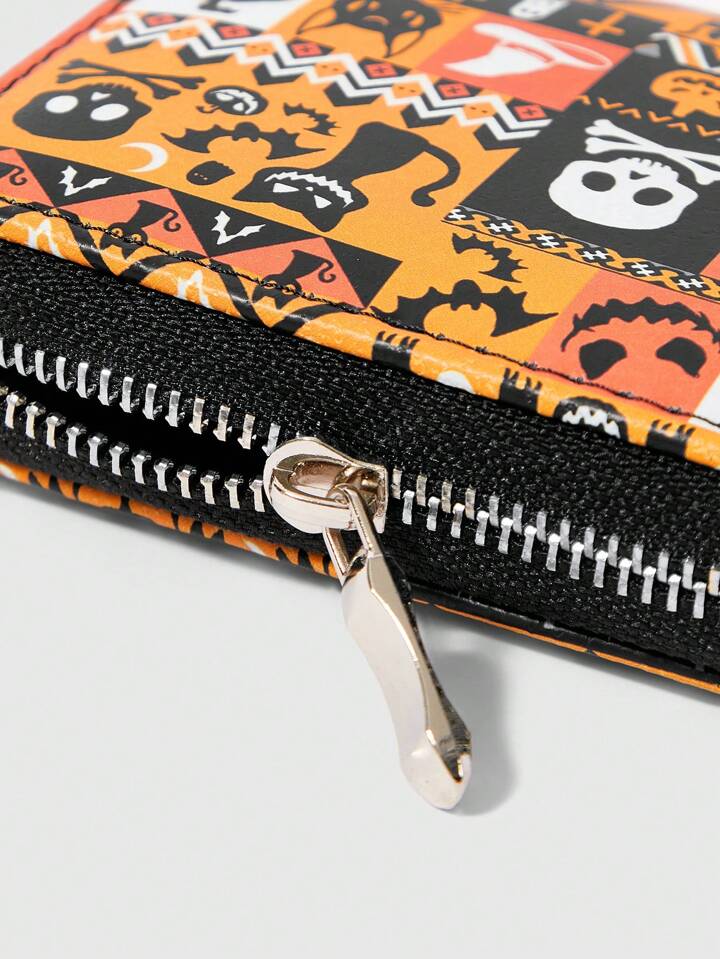 1 pieza Monedero con cremallera minimalista para mujer con diseño de calavera de gato negro de Halloween