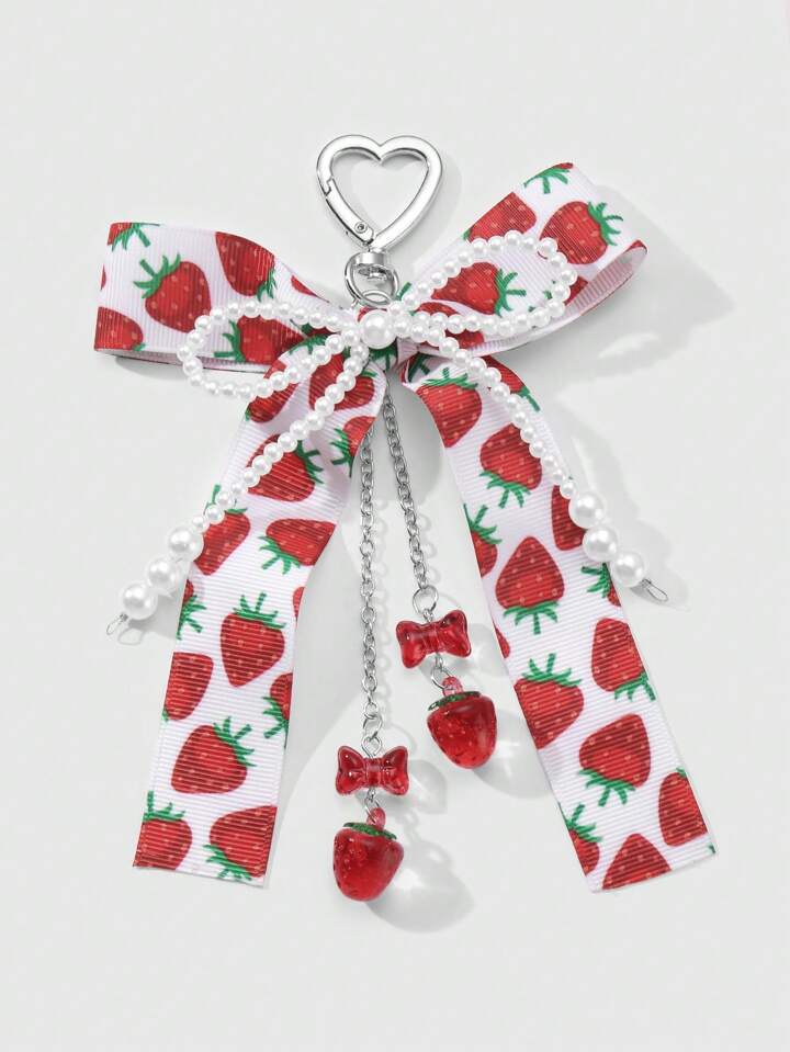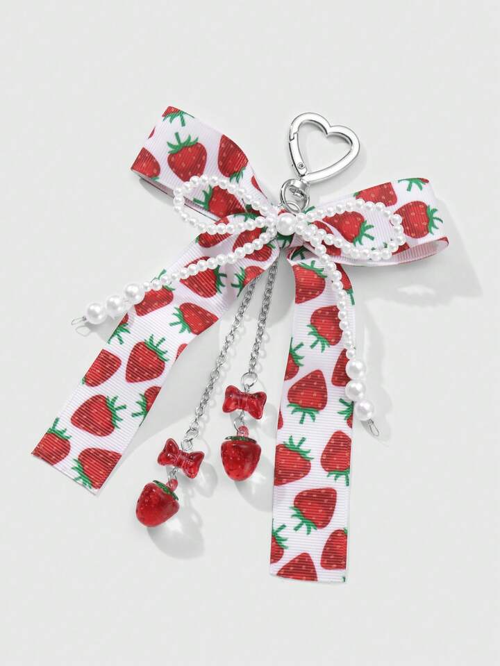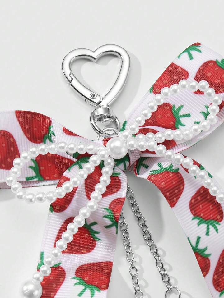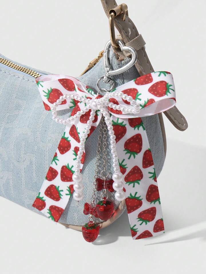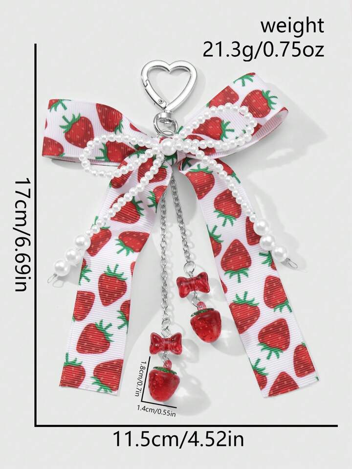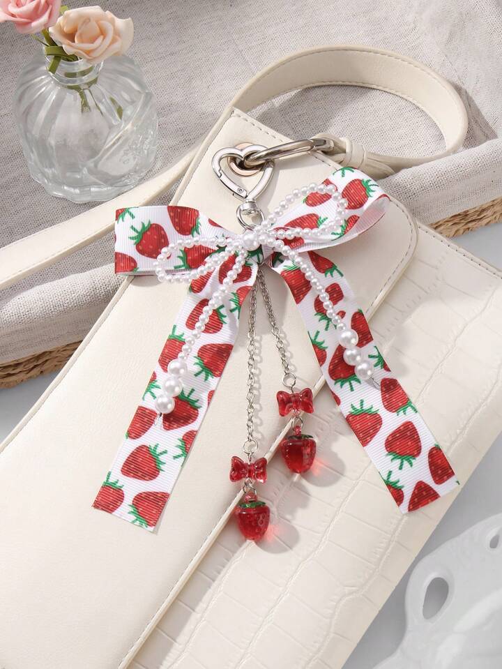 Kawaii 1 pieza Colgante de diseño con lazo de cuentas hecho a mano, perla blanca, cinta roja, fresa, ideal para llavero, dije de bolso, elegante y de moda, adecuado para mujeres, niñas, uso diario, regalo para vacaciones