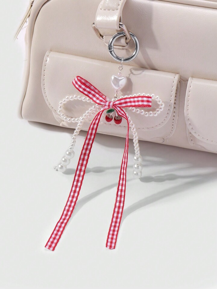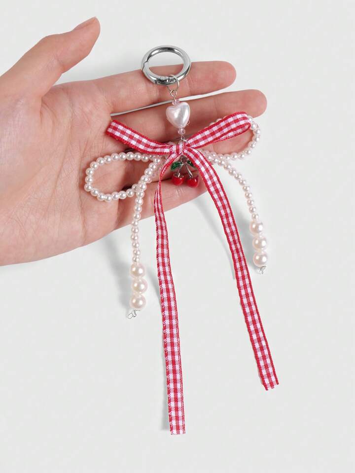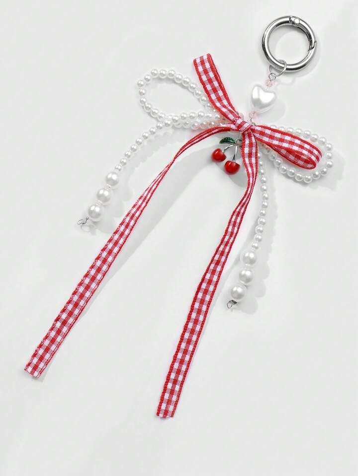 Kawaii 1 pieza Accesorio de bolso/llavero hecho a mano con perla, cinta a cuadros rojos, moño, y encanto de cereza. Diseño lindo y dulce, adecuado para uso diario o como regalo para mujeres en San Valentín