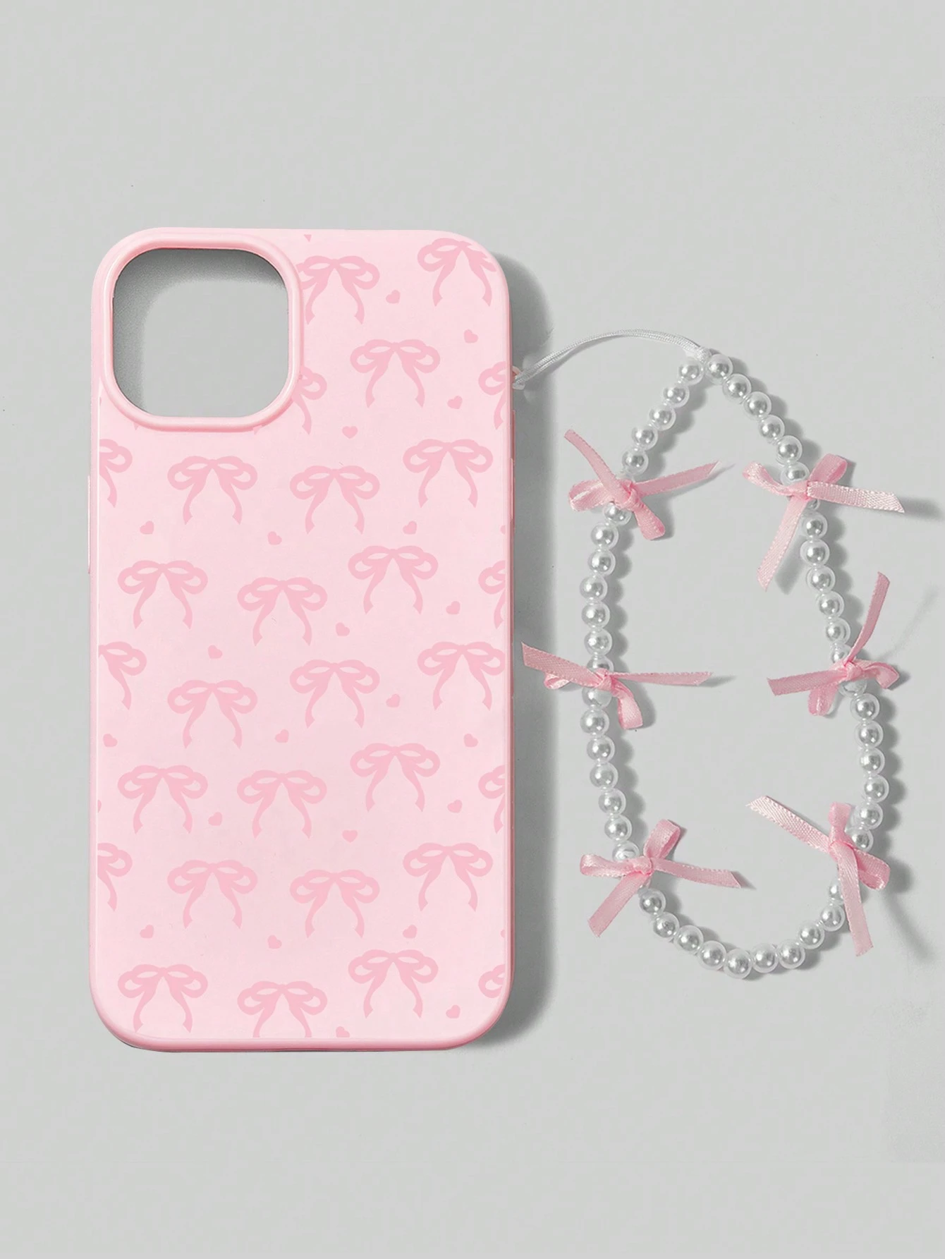 Kawaii 1 pieza Estuche de teléfono móvil con diseño de corazón, lunares y moño, color rosa