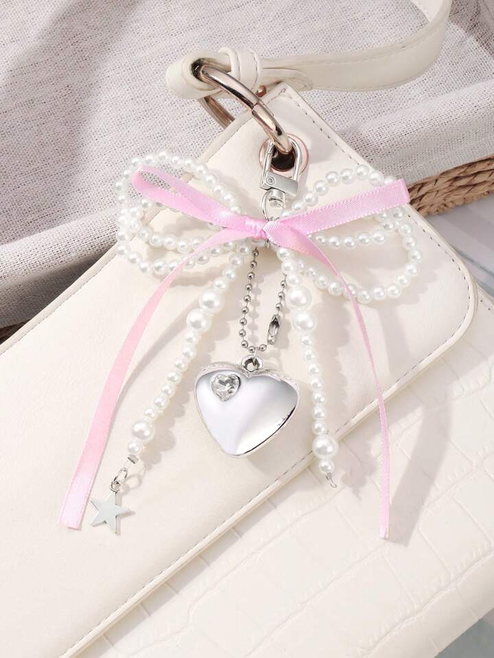 Kawaii 1 pieza Estilo Ins Elegante Conjunto de llavero y dije con perlas artificiales blancas hechas a mano, lazo de cinta rosa, cadena de perlas plateadas y dije de estrella y corazón de diamante CCB, adecuado para niñas, hermanas, mejores amigas, uso diario, regalo de vacaciones