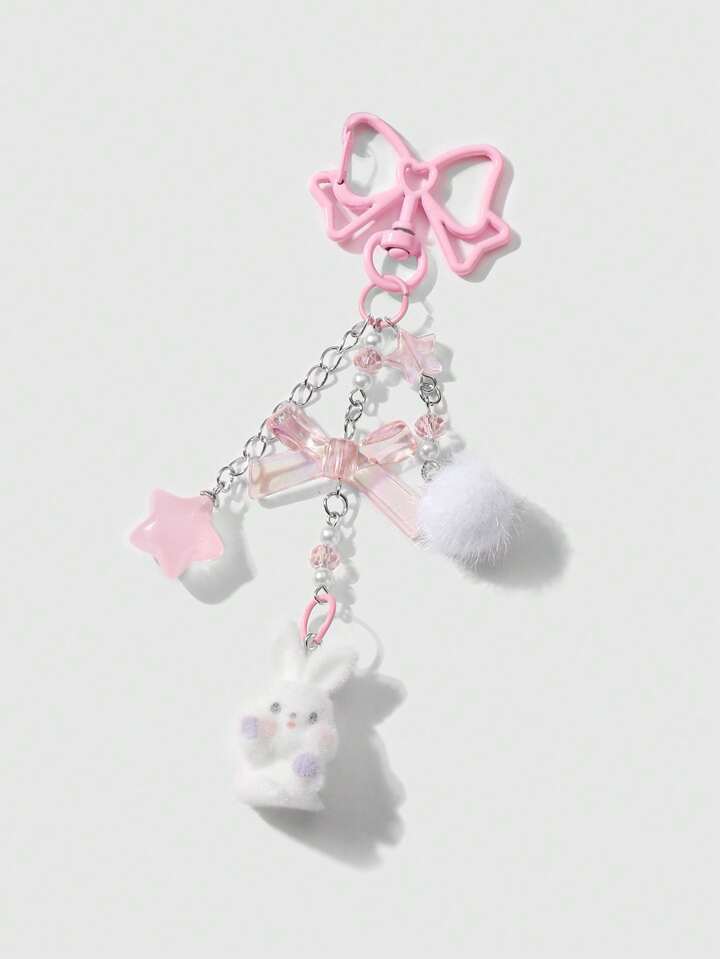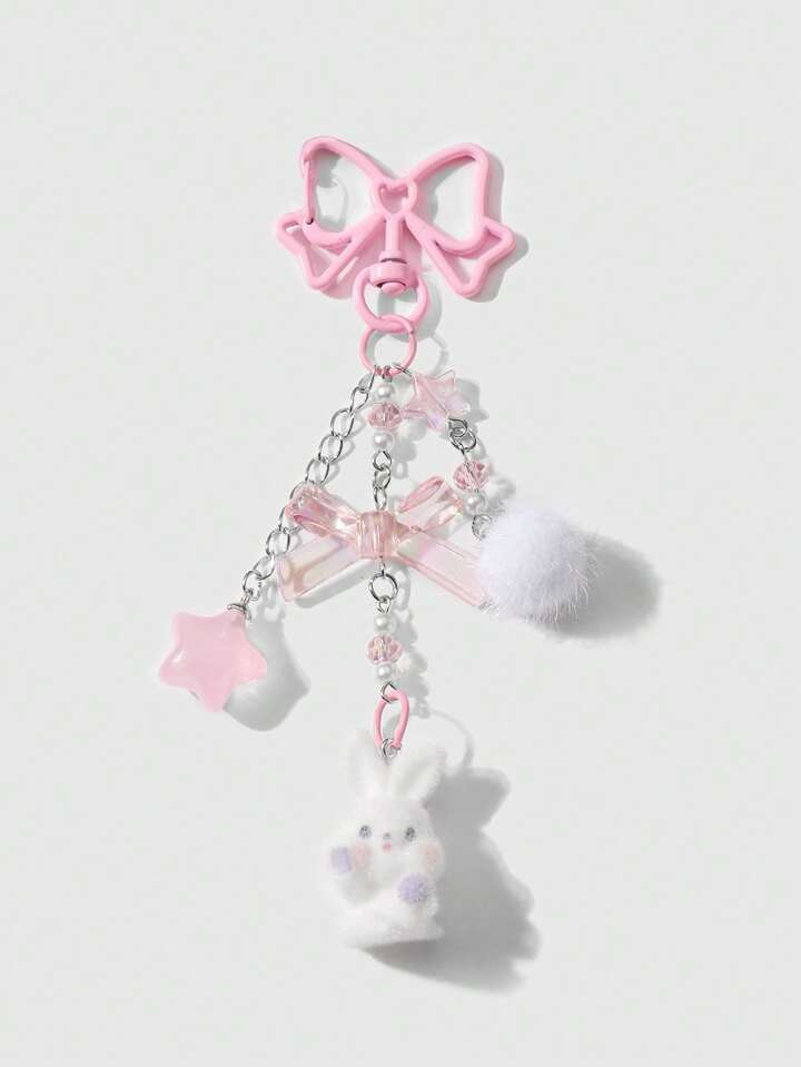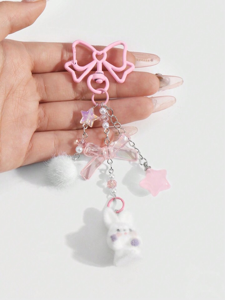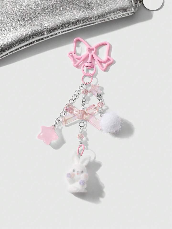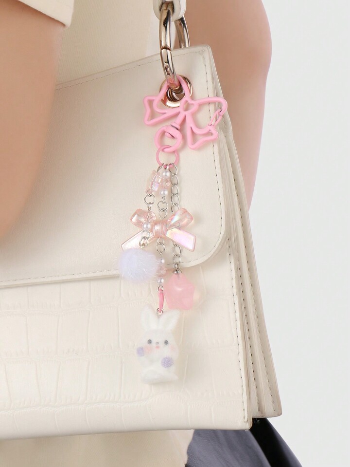 Kawaii 1 pieza Llavero y llavero con colgante de conejo con moño, perla falsa, cadena plateada de alta calidad y bola de pelo de estilo coreano, elegante y adorable, adecuado para mujer, uso diario o regalo de San Valentín