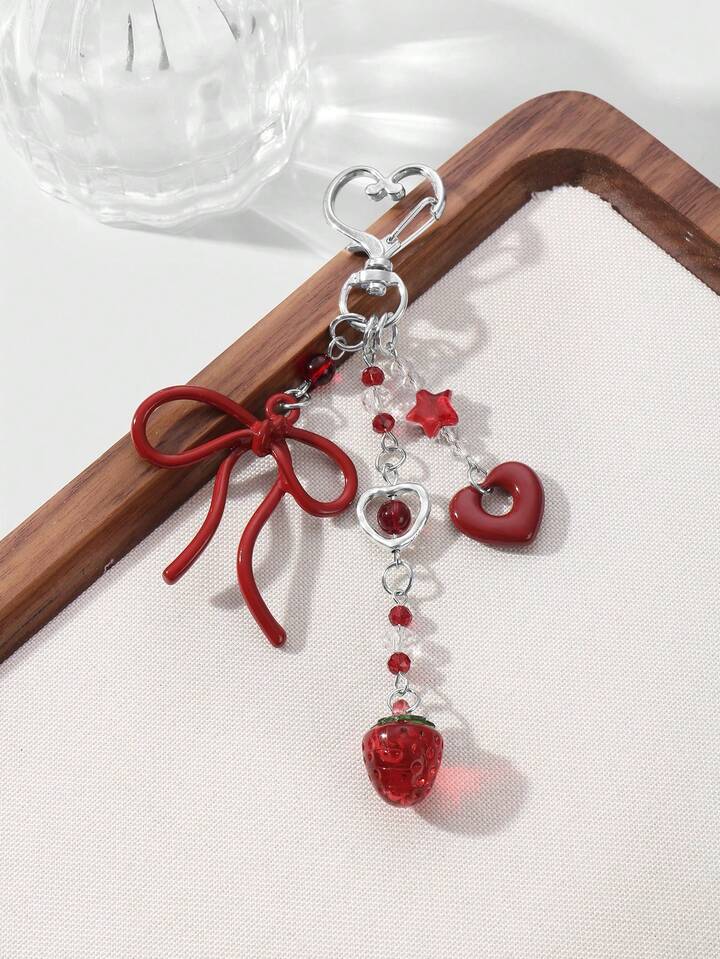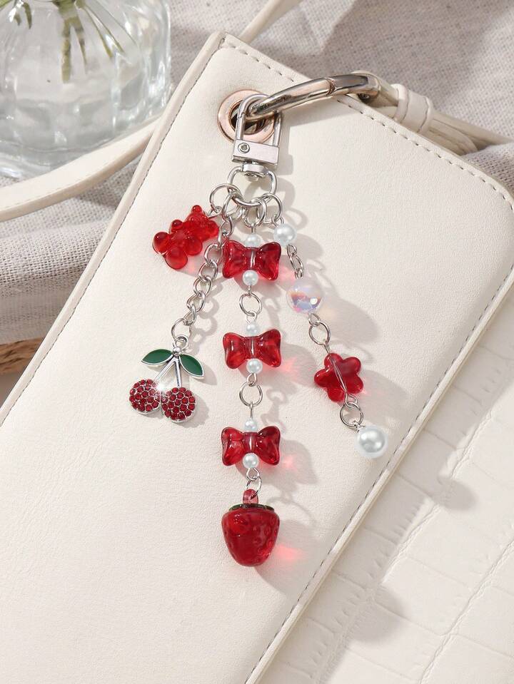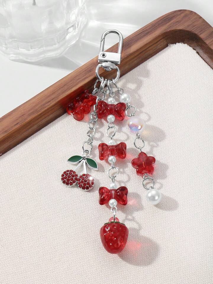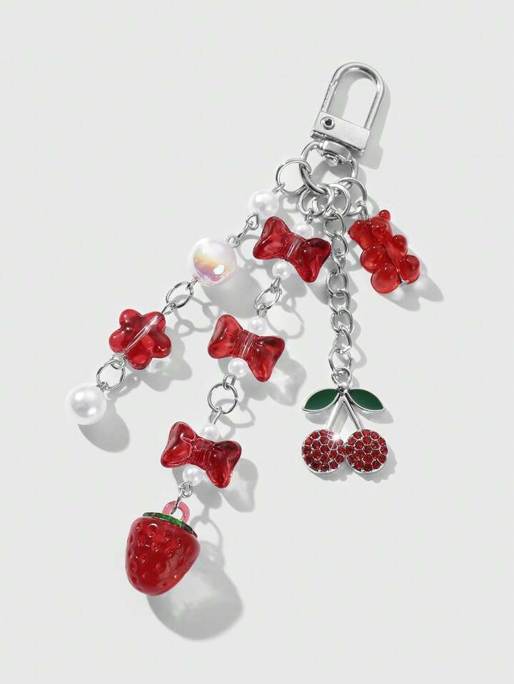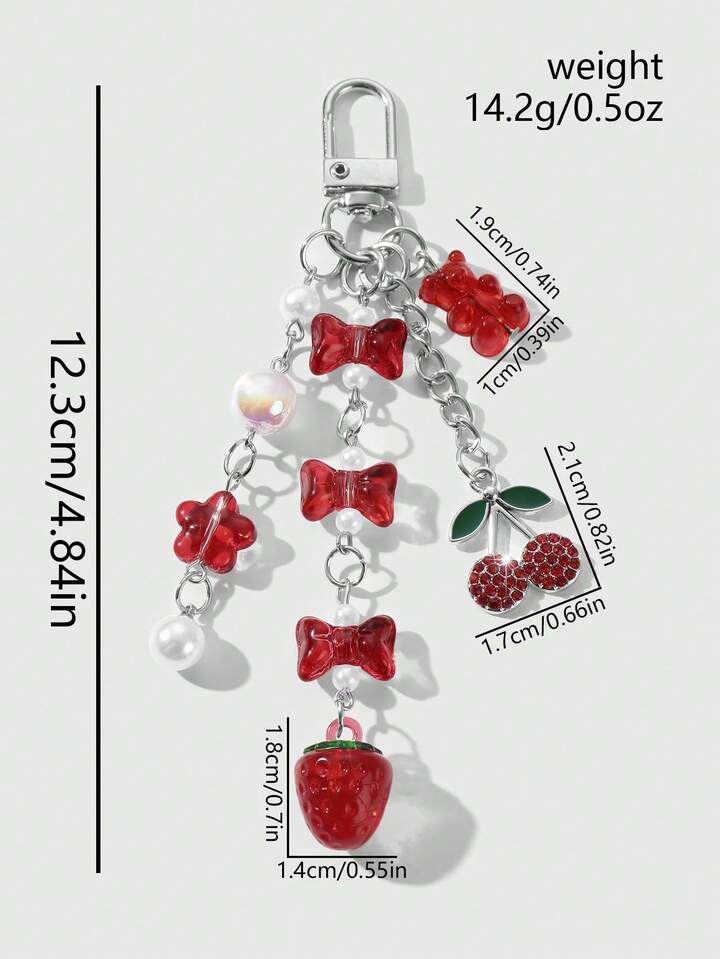 Kawaii 1 pieza Llavero colgante de fresa/cereza de estilo coreano elegante y chic con cadena de plata, lazo de acrílico y resina, accesorio de moda como regalo para mujeres y niñas, para uso diario