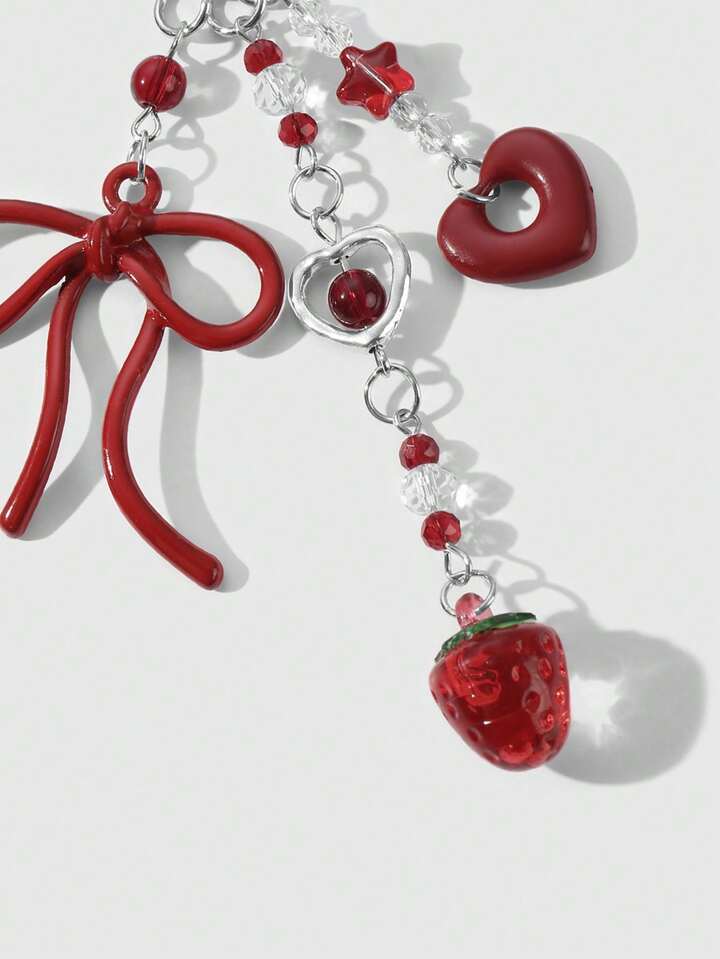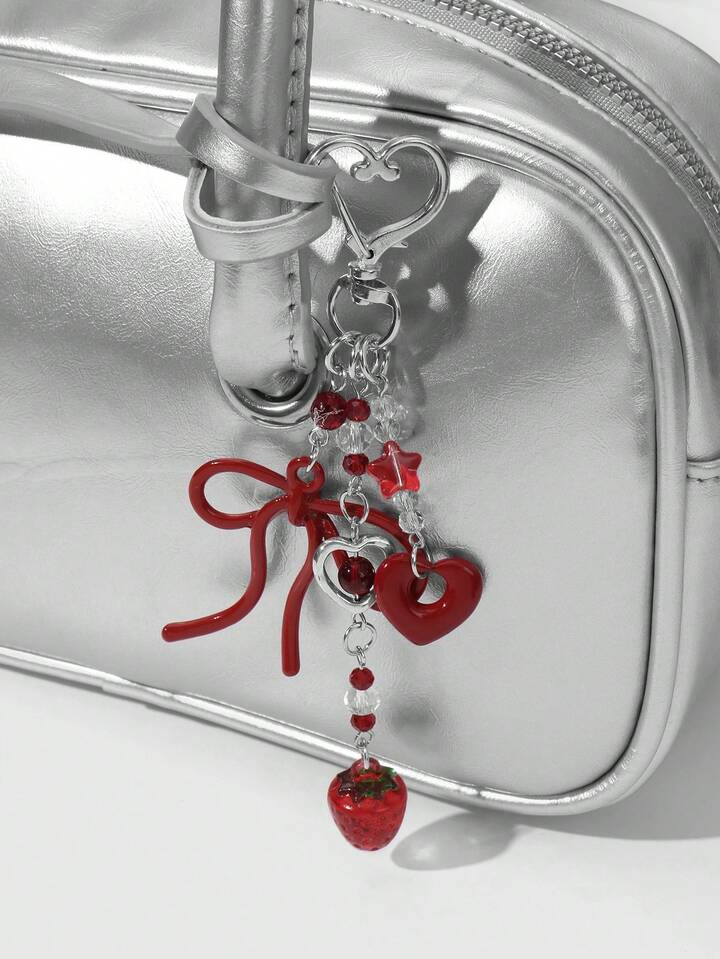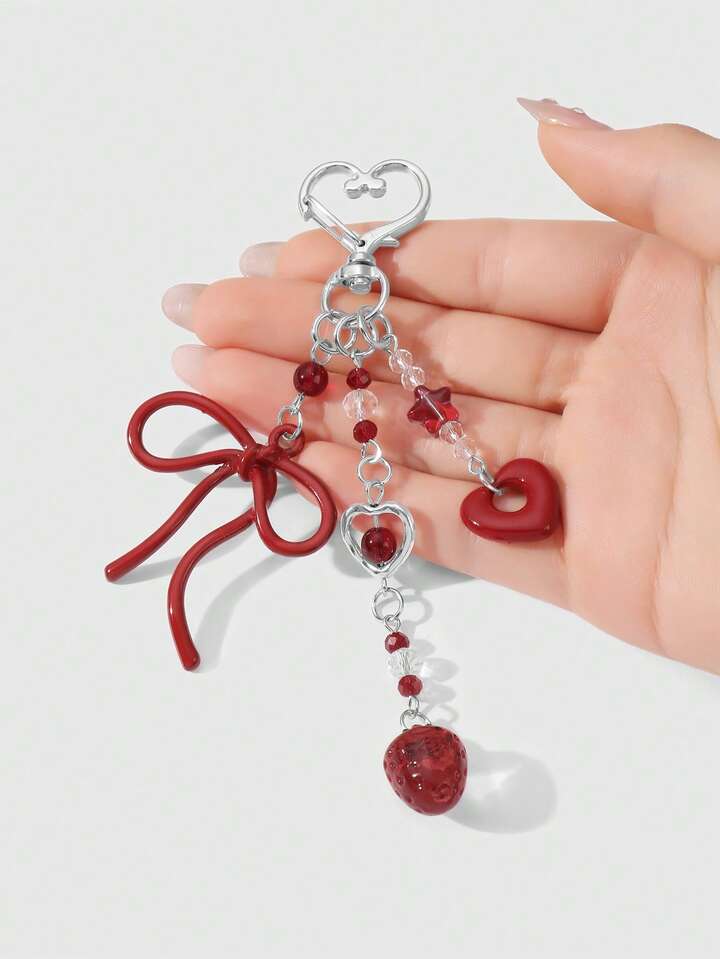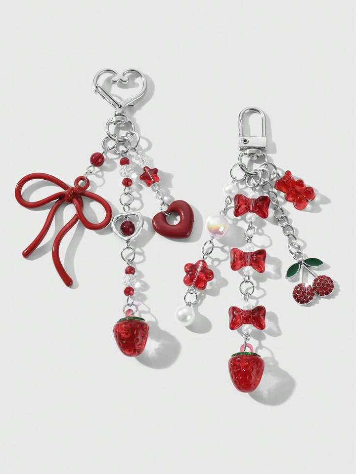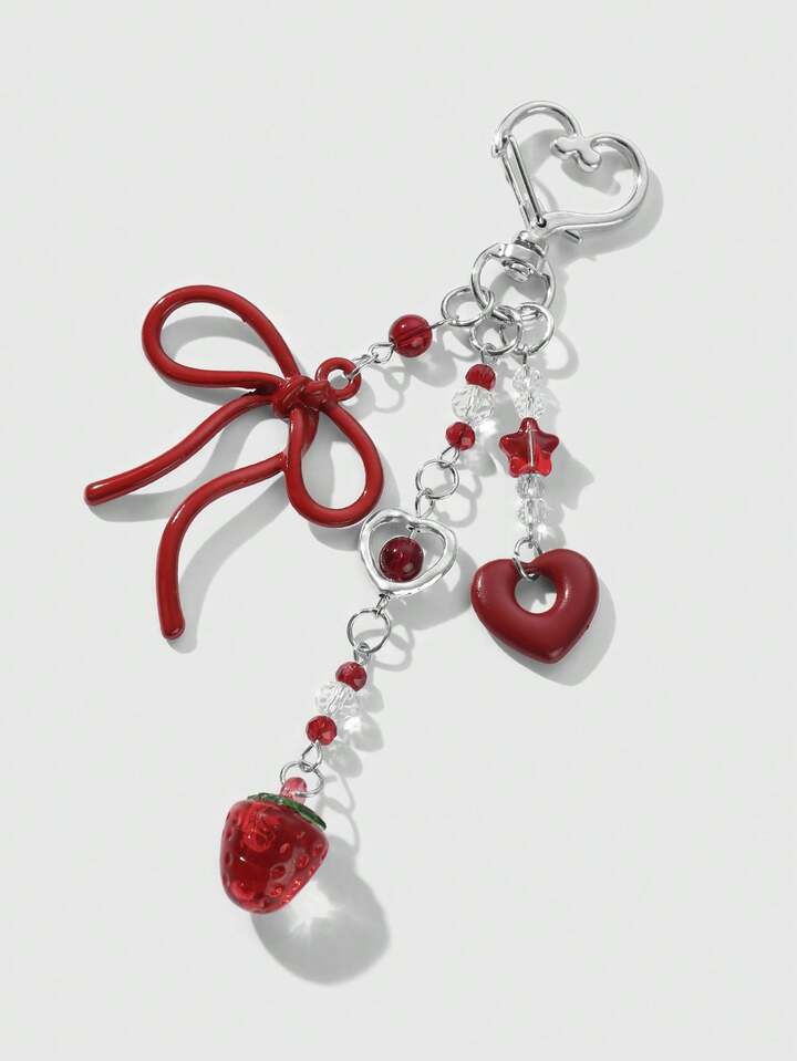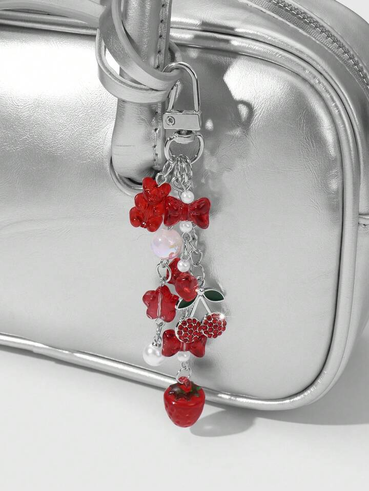 Kawaii 1 pieza Llavero colgante de fresa/cereza de estilo coreano elegante y chic con cadena de plata, lazo de acrílico y resina, accesorio de moda como regalo para mujeres y niñas, para uso diario