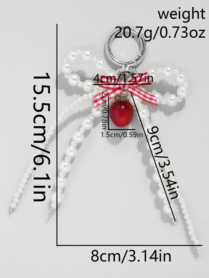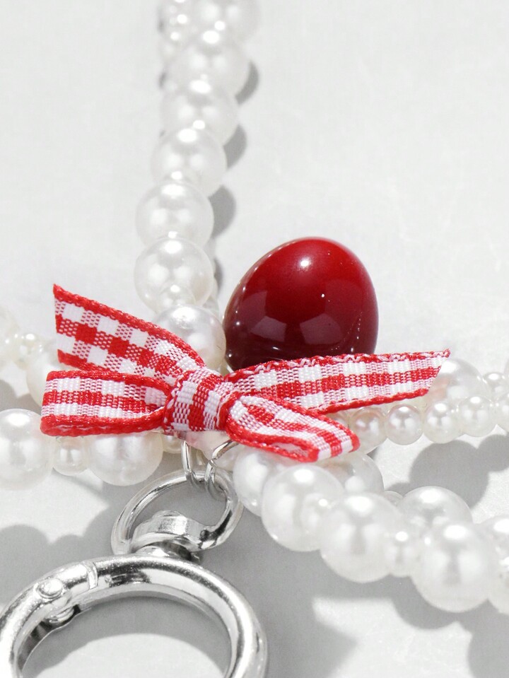 Kawaii 1 pieza Llavero con colgante de lazo de cinta a cuadros rojos y falsa perla con forma de cereza, estilo coreano minimalista, dulce y fresco, accesorio para bolso para San Valentín