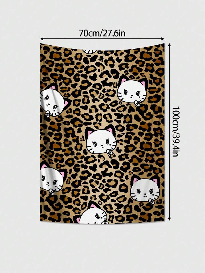 Kawaii 1 pieza Tapiz con fondo estampado de leopardo y patrón de gato adorable, adecuado para sala de estar y dormitorio