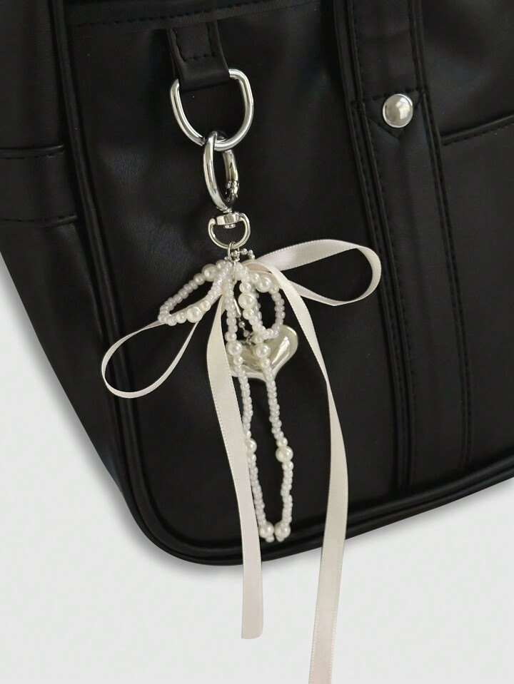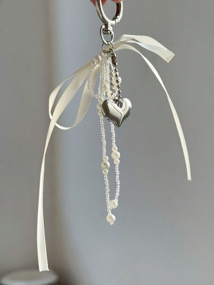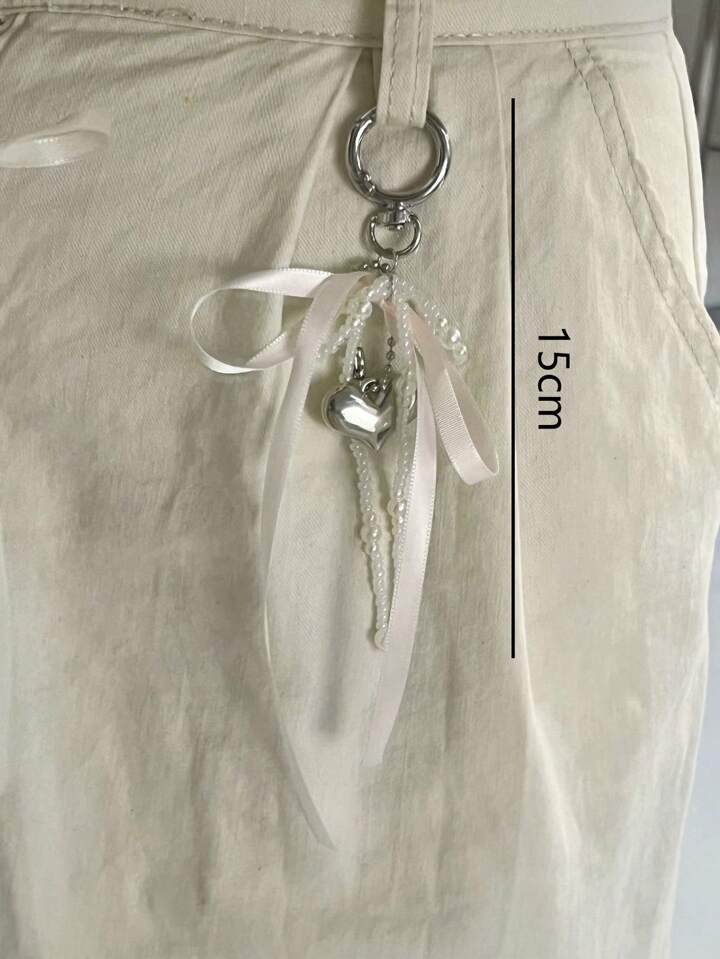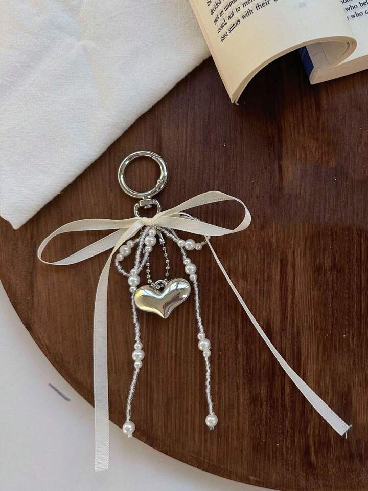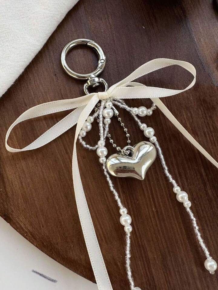 Kawaii 1 pieza Llavero colgante con adorno de lazo de perla, llavero con colgante en forma de corazón al estilo ins