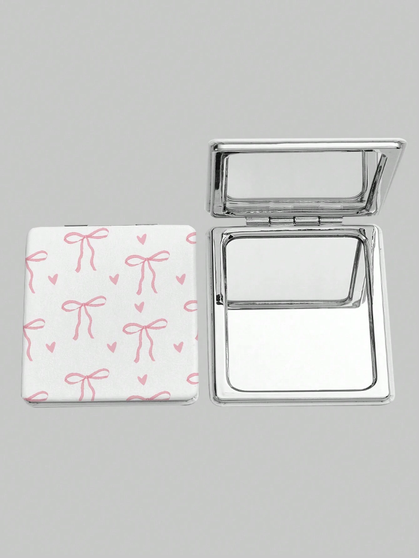 Kawaii 1 pieza Espejo de maquillaje cuadrado con estampado de lazo rosado y corazón, espejo portátil de mano para niñas (la colocación del diseño es aleatoria)