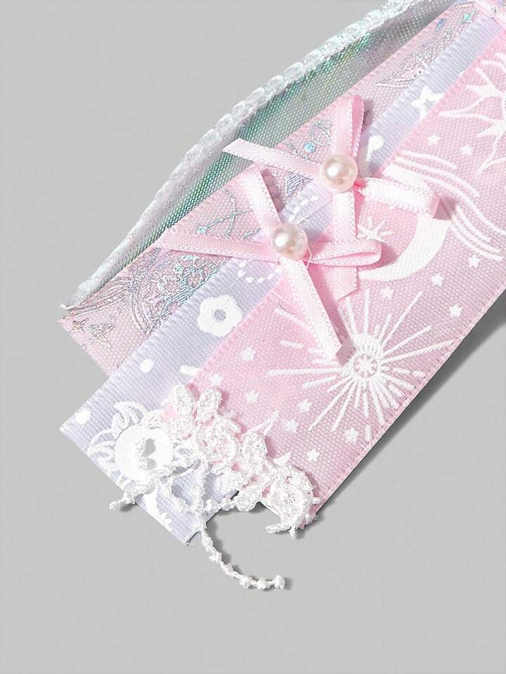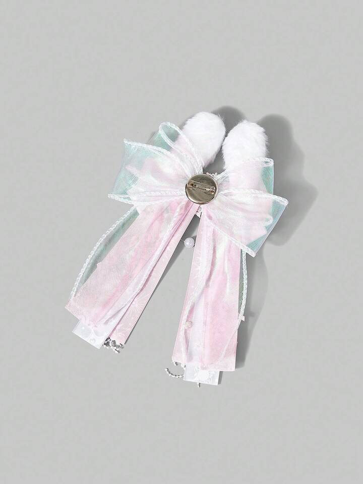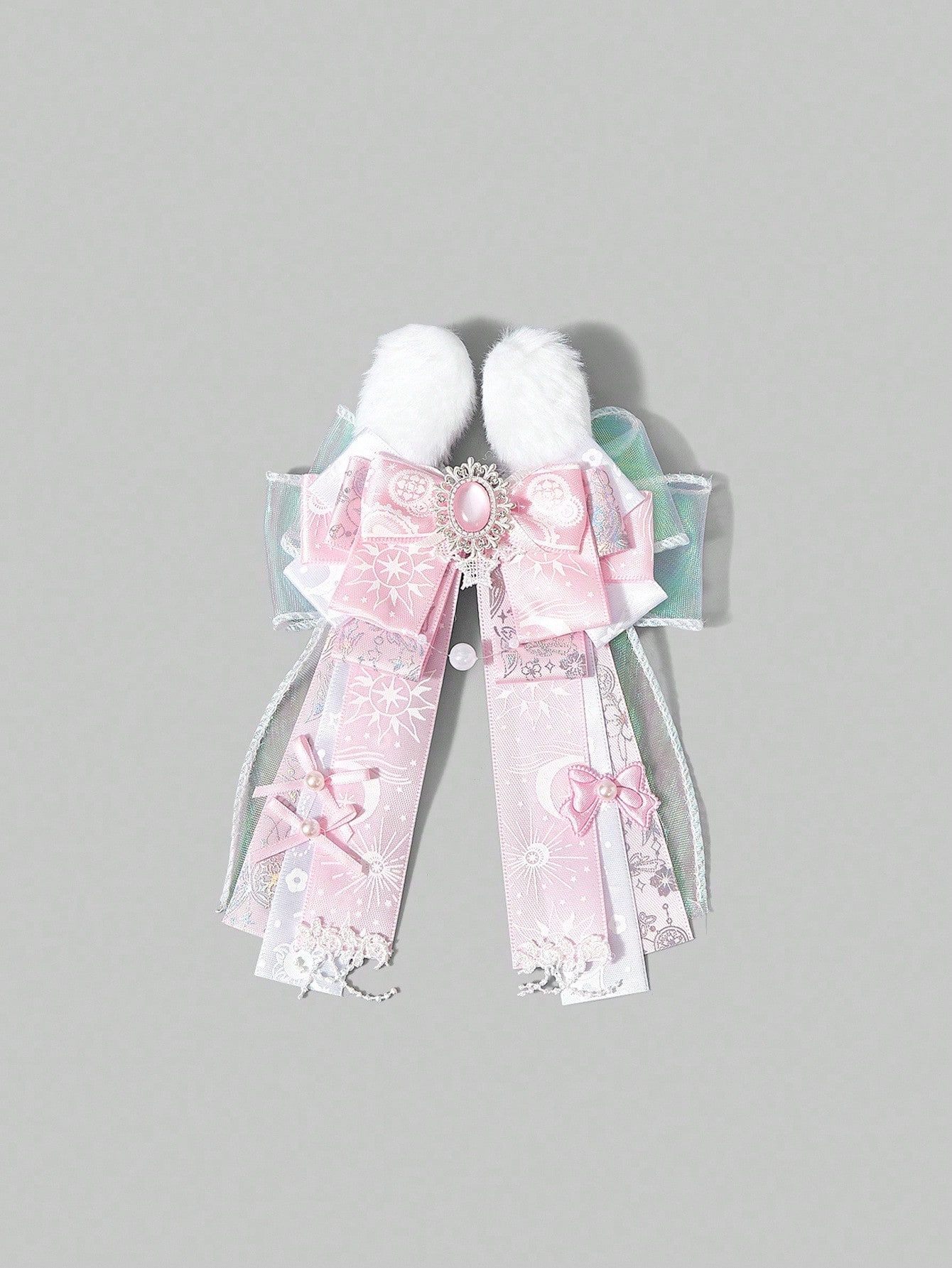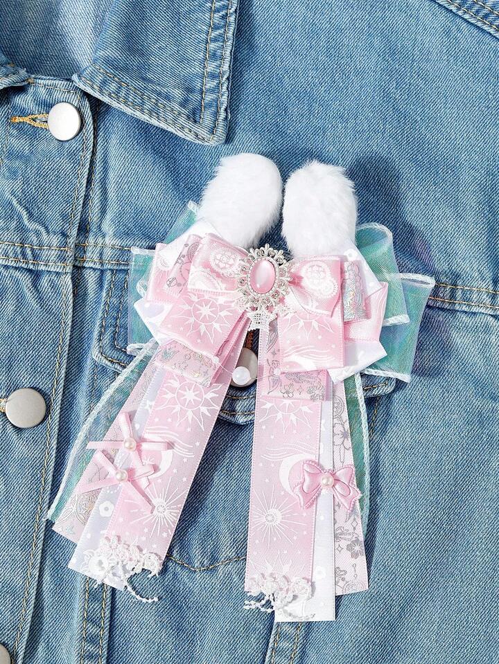 Kawaii 1 pieza Broche de mujer en forma de lazo con orejas de conejo rosas, estampado de pastel, ribete de encaje, estampado de estrella de lámina Y2K, puede usarse como decoración para bolsos, pantalones, faldas, hecho a mano, estilo Lolita