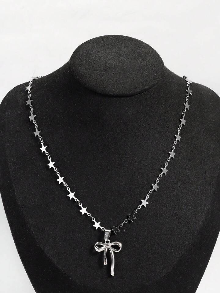 Kawaii 1 pieza Collar de mujer con colgante de lazo de cadena de estrella de cinco puntas de color plateado