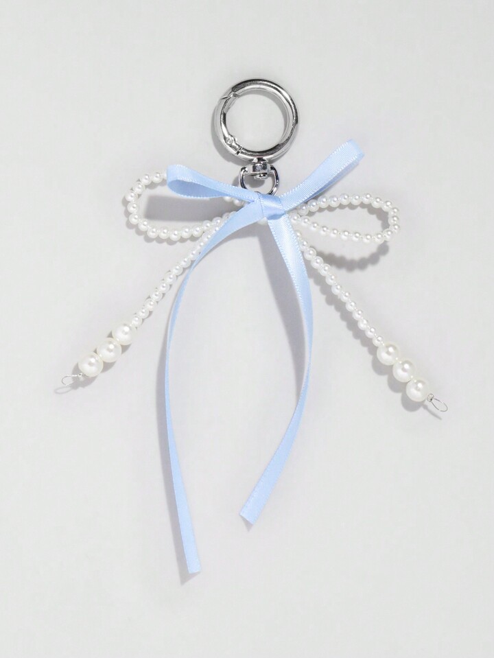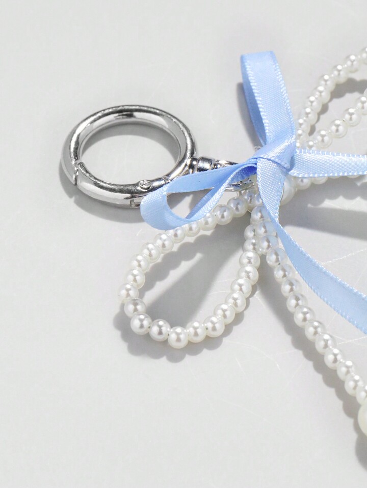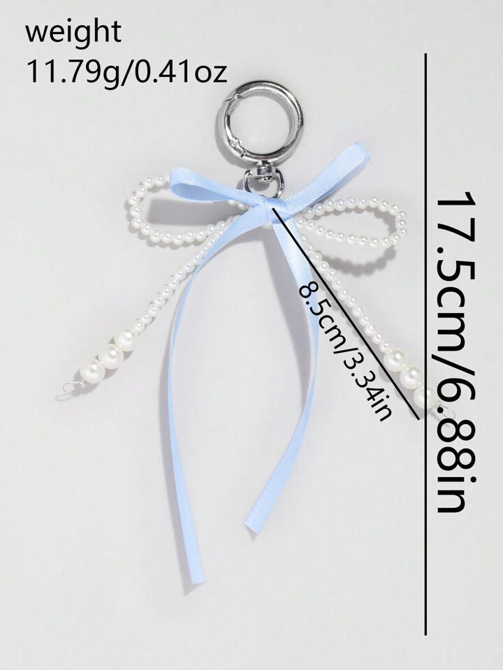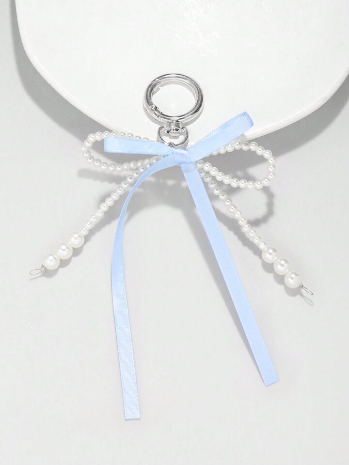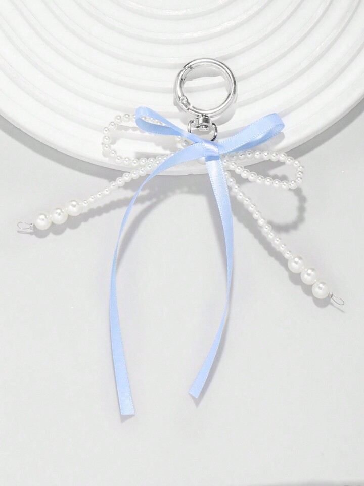 Kawaii 1 pieza Llavero con colgante de lazo de cinta azul simple y único con perla falsa, anillo para llaves, accesorio para bolso, regalo para festividades y San Valentín