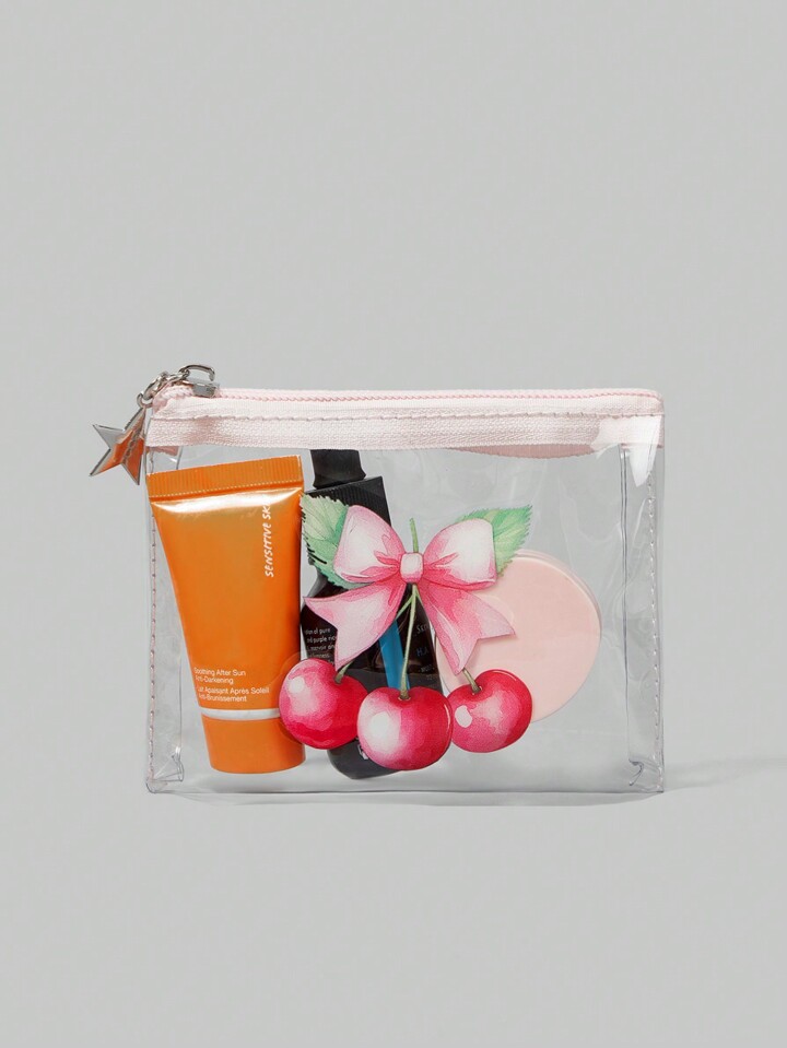 Kawaii 1 pieza Bolsa de cosméticos de maquillaje con decoración de lazo de cereza transparente de PVC