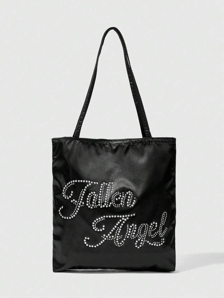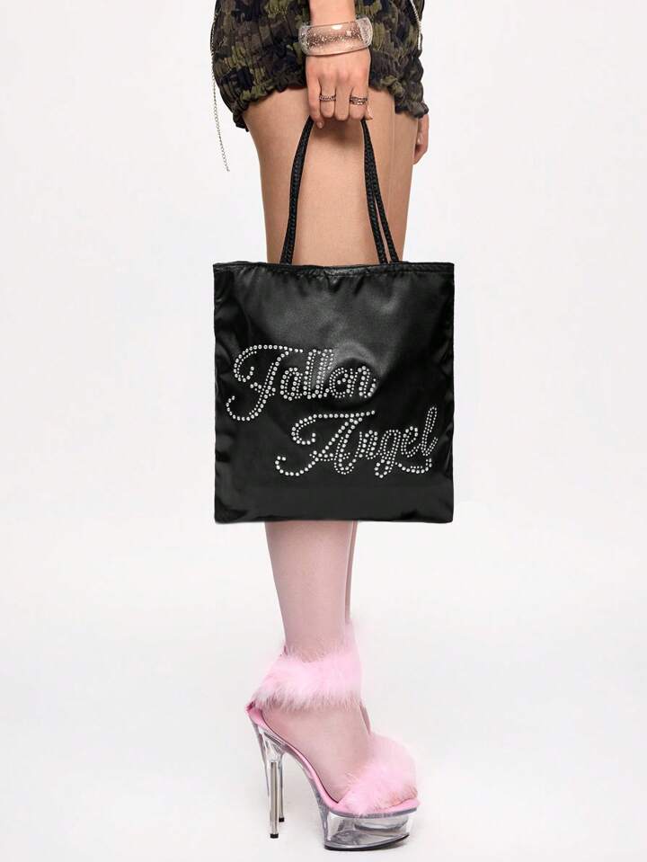 Kawaii 1 pieza Bolso de tela de raso negro para mujer con patrón de ángel caído de rhinestone