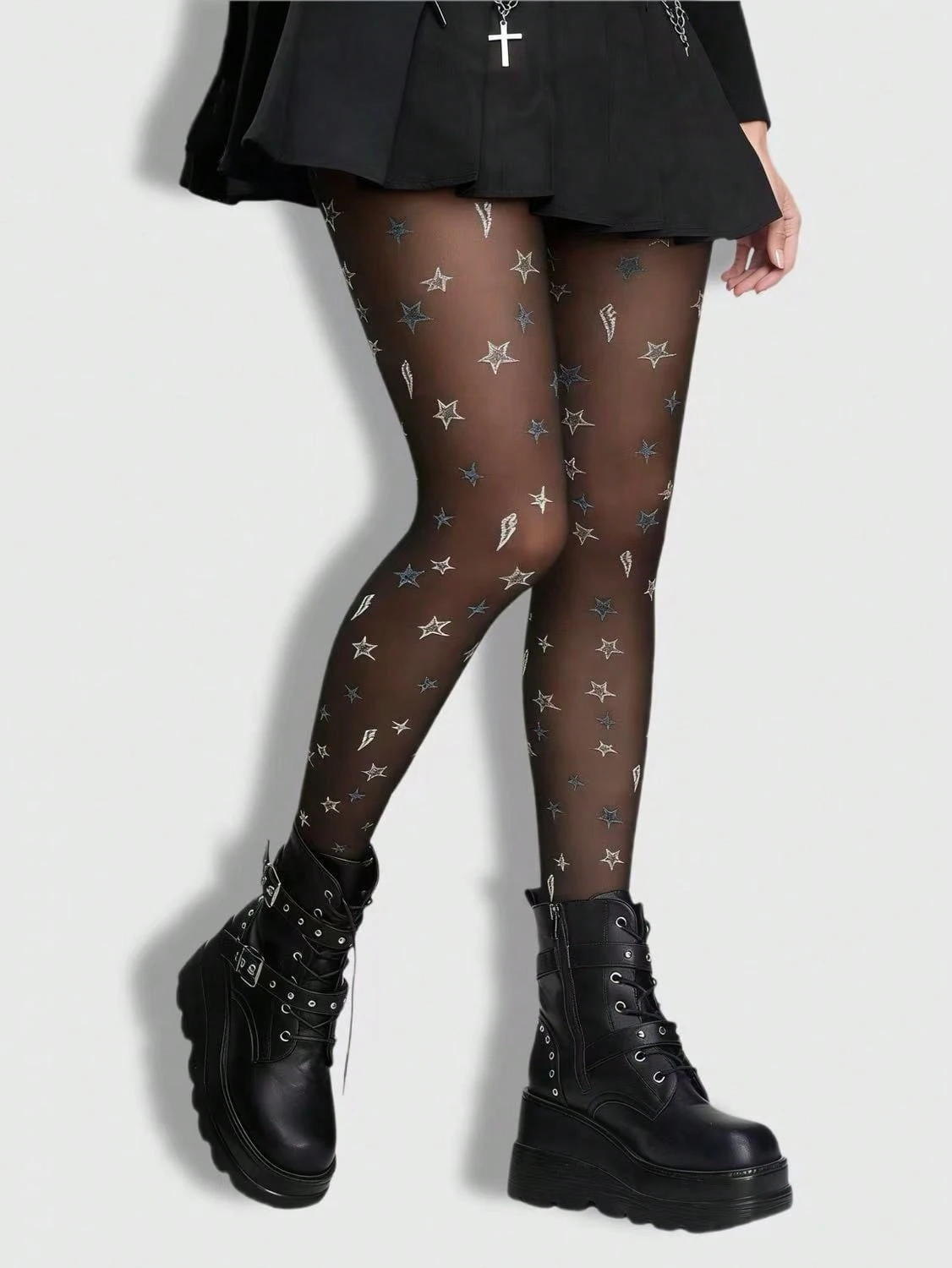 Kawaii 1 pieza Medias/pantimedias/leggings sexy de mujer con estampado de estrella negra y floral