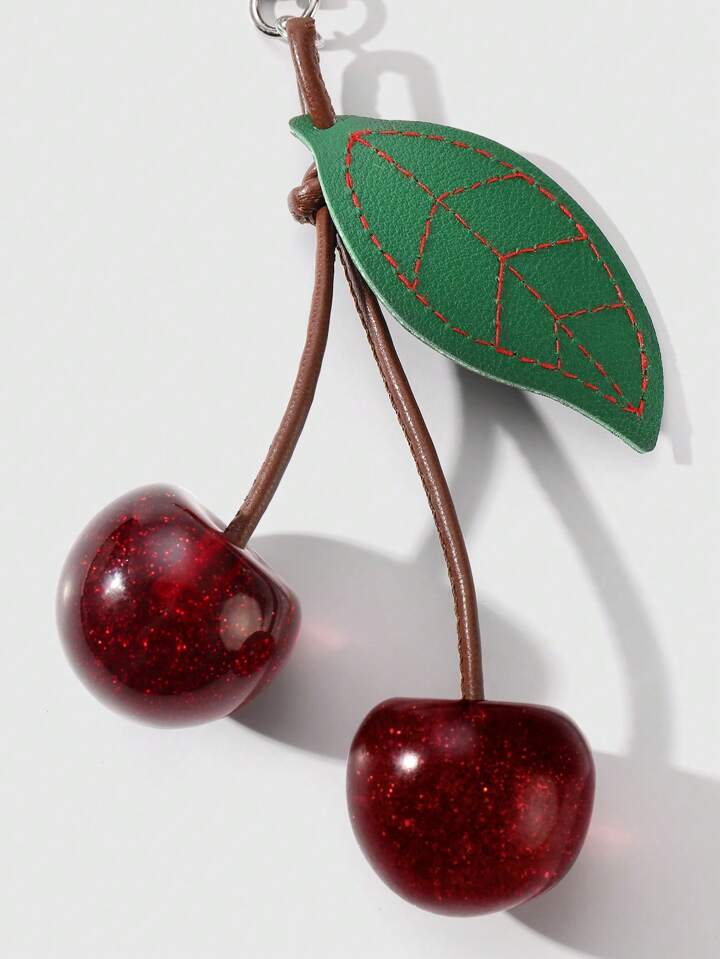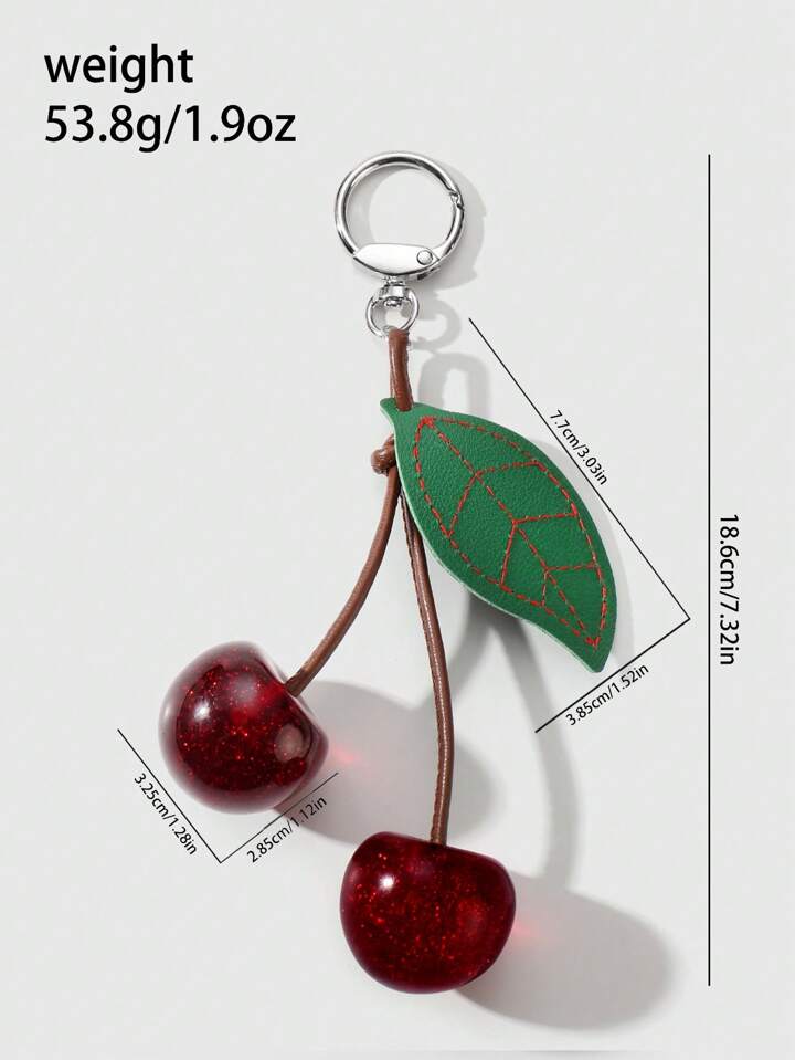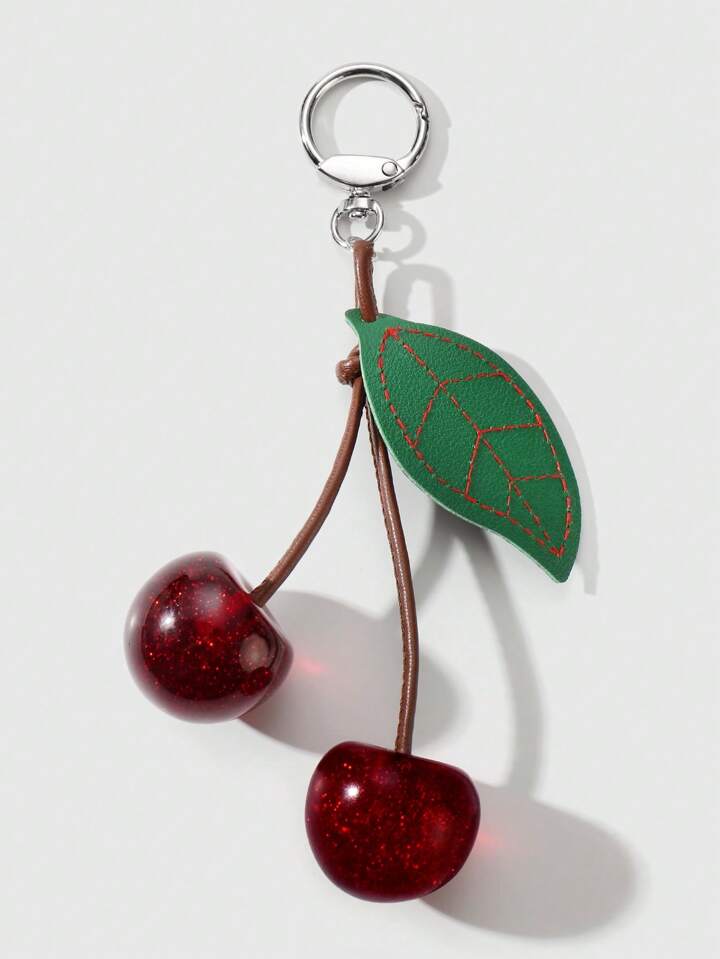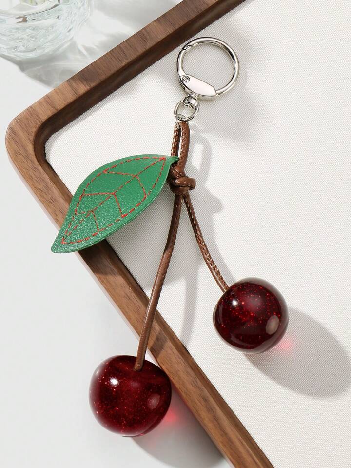 Kawaii 1 pieza Elegante lujoso y dulce Y2K, llavero con colgante de hoja de resina y cereza de alta calidad en cordón marrón, accesorio decorativo DIY para bolsos, adecuado para mujer, uso diario, regalo de festival