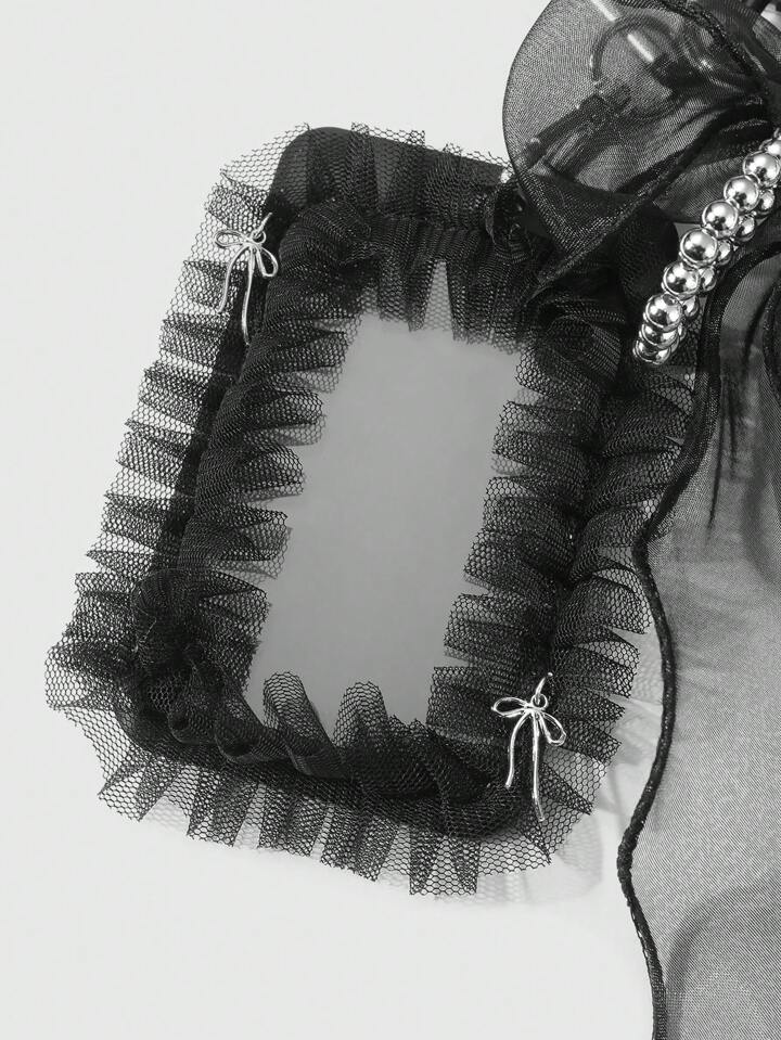 Kawaii 1 pieza Accesorio de tarjetero deslizante de encaje hueco con cuentas de estilo gótico de moda retro Y2K, hecho a mano con CCB negro brillante y malla plateada, adecuado para trabajadores de oficina, estudiantes, uso diario, regalo de vacaciones