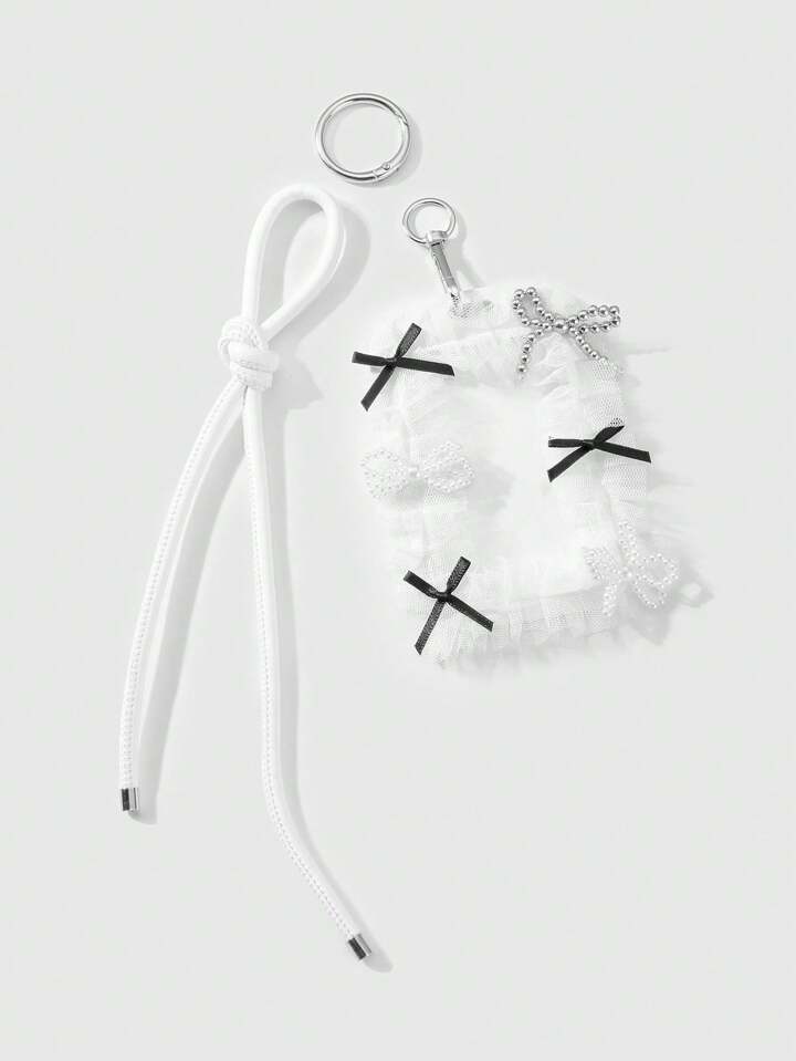 Kawaii 1 pieza Estuche y cordón de identificación minimalista y elegante de lujo estilo Y2K hecho a mano con perlas y lazo de encaje, accesorio DIY para llavero/colgante de bolso, adecuado para trabajadores de oficina, estudiantes, uso diario, regalo de vacaciones