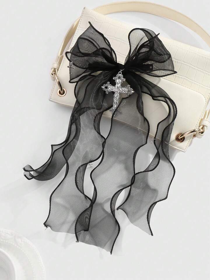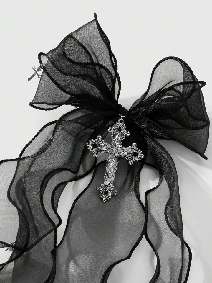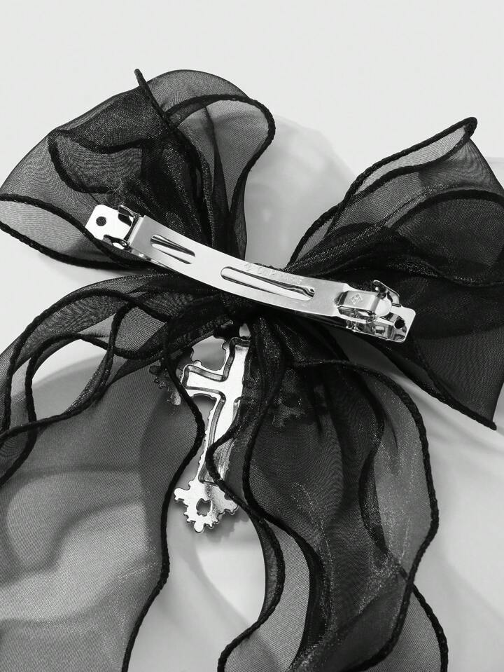 Kawaii 1 pieza de accesorio para el cabello tipo pinza de primavera con estilo cruzado floral hueco plateado, lazo doble y malla negra en estilo oscuro gótico Y2K, adecuado para uso diario y como regalo festivo para mujeres