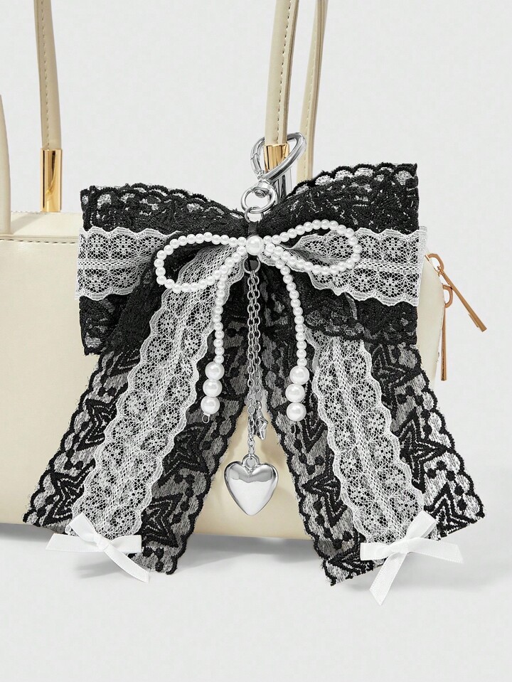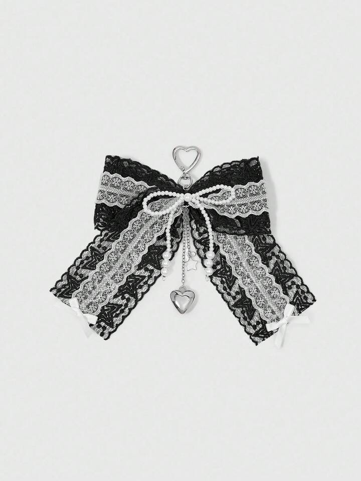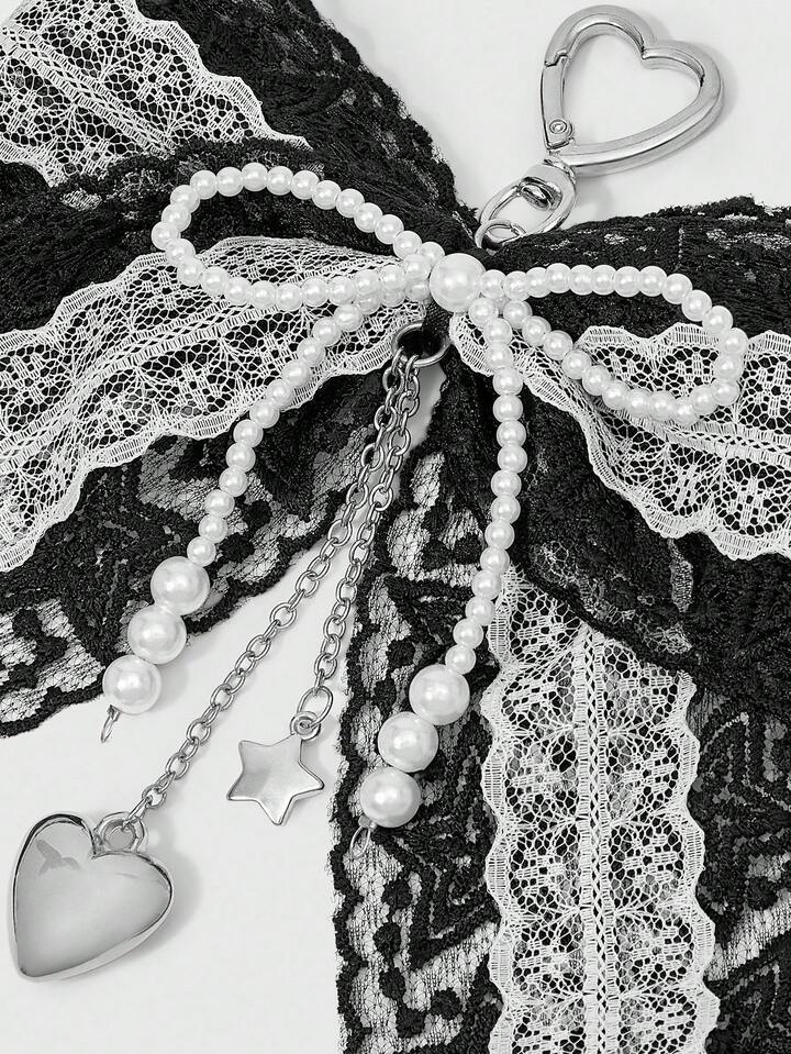 Kawaii 1 pieza Accesorio colgante de llave, adorno para bolso, estilo gótico retro Y2K hecho a mano con cuentas, cinta de encaje negro y blanco, moño y adornos de corazón y estrella de CCB, adecuado para mujeres, uso diario y regalos festivos, Halloween