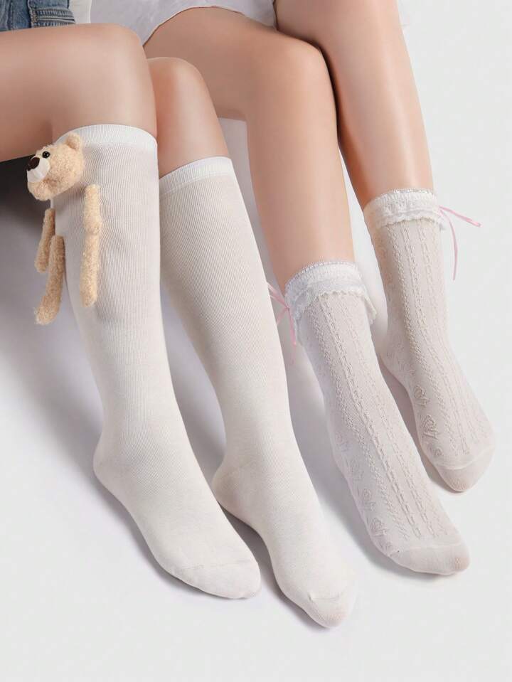 Kawaii 2 pares de calcetines altos hasta la rodilla con estampado de rayas y lazo de encaje de oso de dibujos animados, estilo preparatoria dulce, adecuado para uso diario, empaquetado en caja de regalo