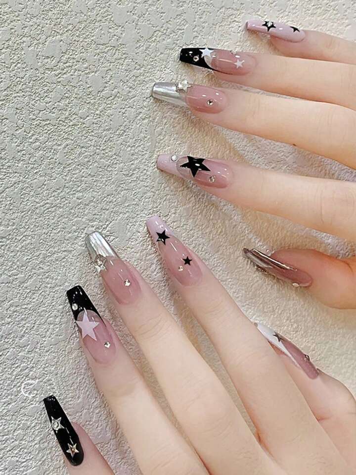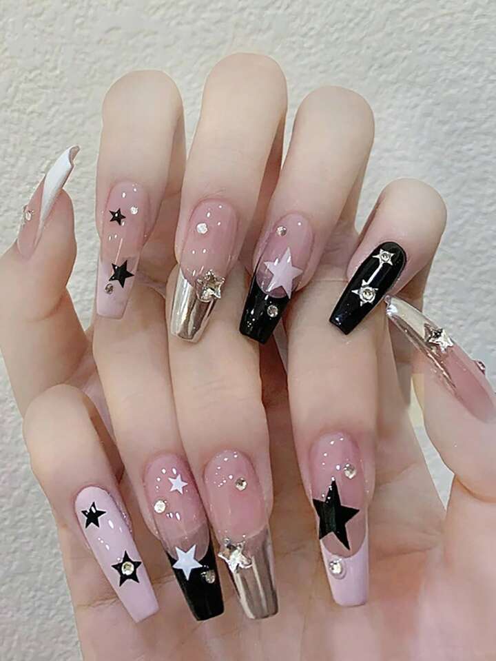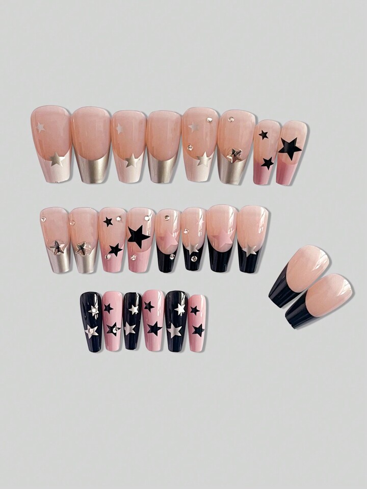 Kawaii 24 piezas largo ataúd con patrón de estrella con diseño de diamante de imitación Uña postiza & 1 hoja cinta