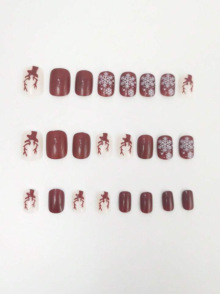 Kawaii 24 piezas Uña postiza corto cuadrado Navidad con estampado de dibujos animados & 1 hoja cinta & 1 pieza lima de uña
