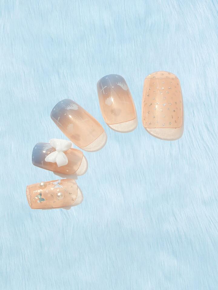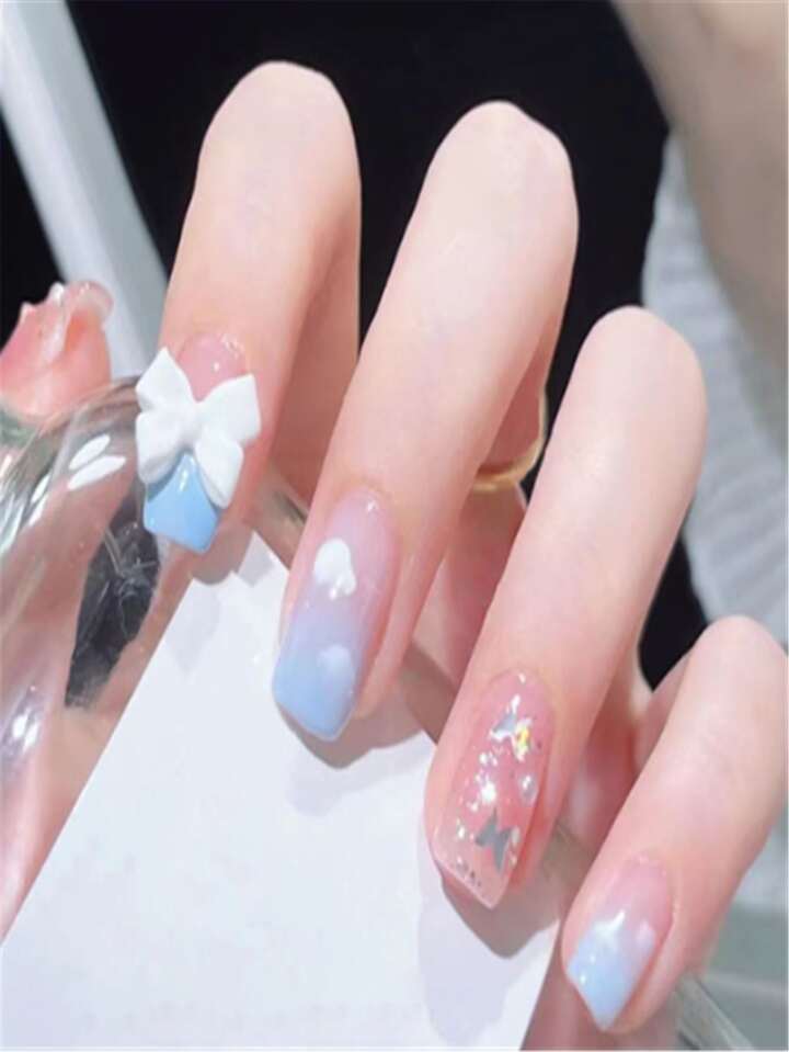 Kawaii 24 piezas Uña postiza cuadrado con patrón de nube & 1 hoja de cinta para uñas y 1 lima de uñas