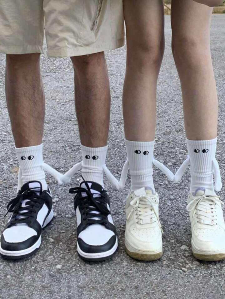 Kawaii 2 Pares De Calcetines Medios Adorables Para Pareja, Diseño De Manos Sujetas
