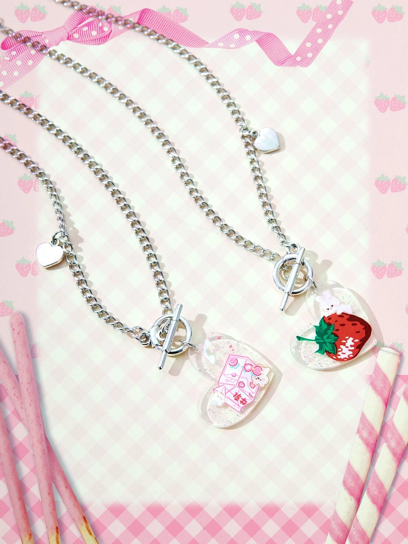 Kawaii 2 piezas Collar de cadena con estampado de dibujos animados con adorno de corazón