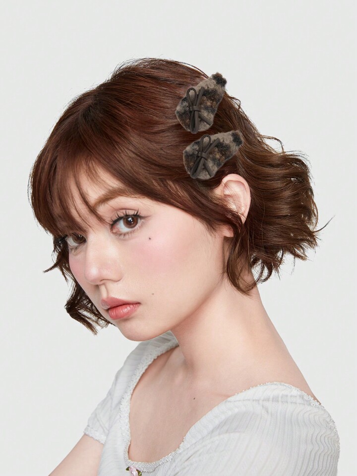 Kawaii 2 piezas Pasquines marrón con acabado de borreguillo y lazo, estilo coreano versátil y elegante para uso escolar, adecuado para uso diario de mujeres/niñas, regalo festivo